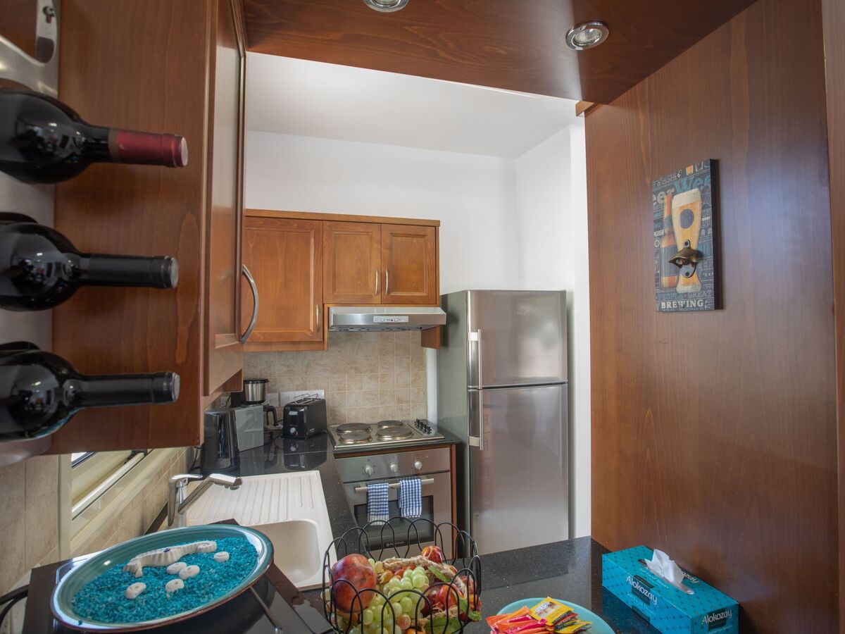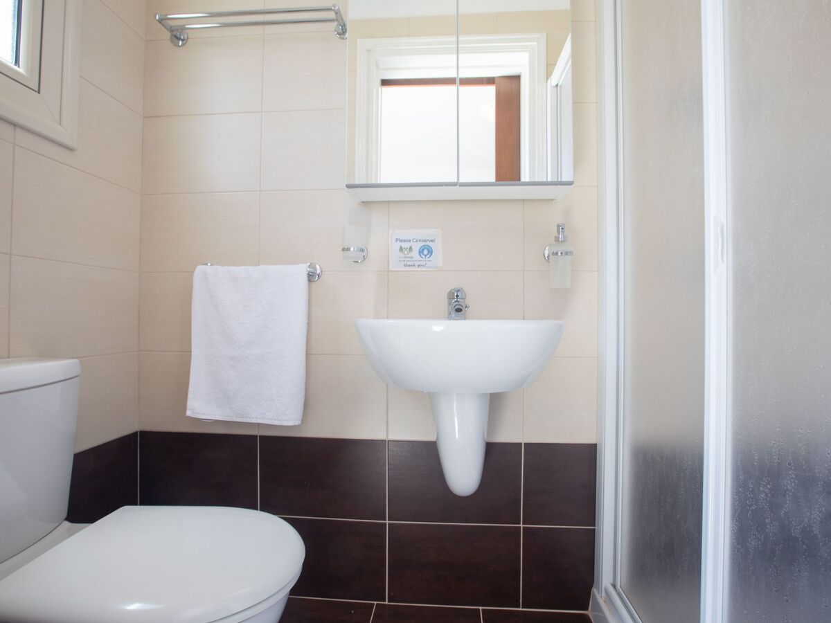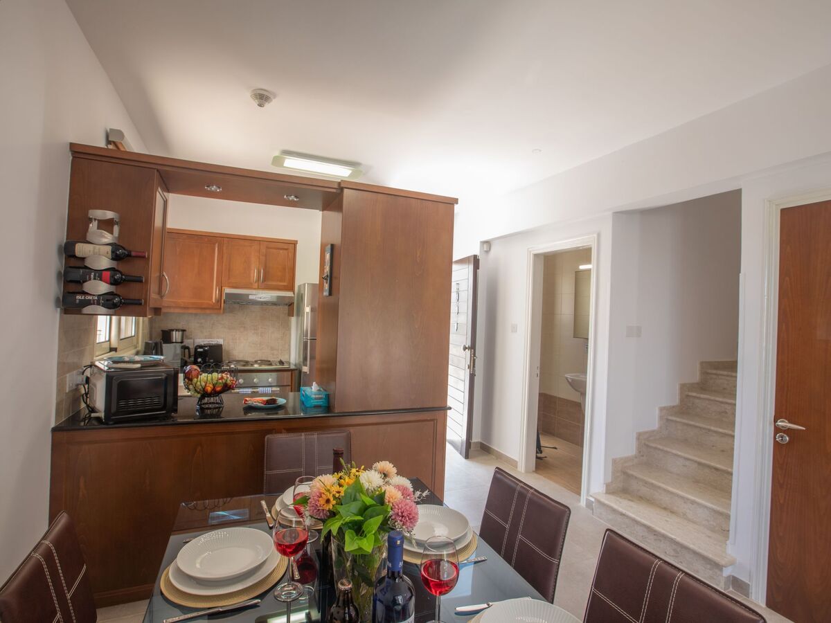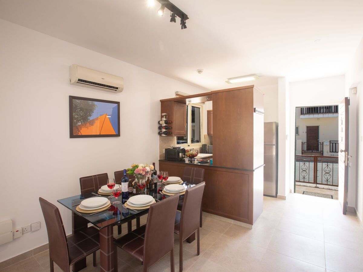 The dining area has table and chairs to seat 6 people, and the modern kitchen is equipped with all appliances and utensils needed for a comfortable self-catering stay.