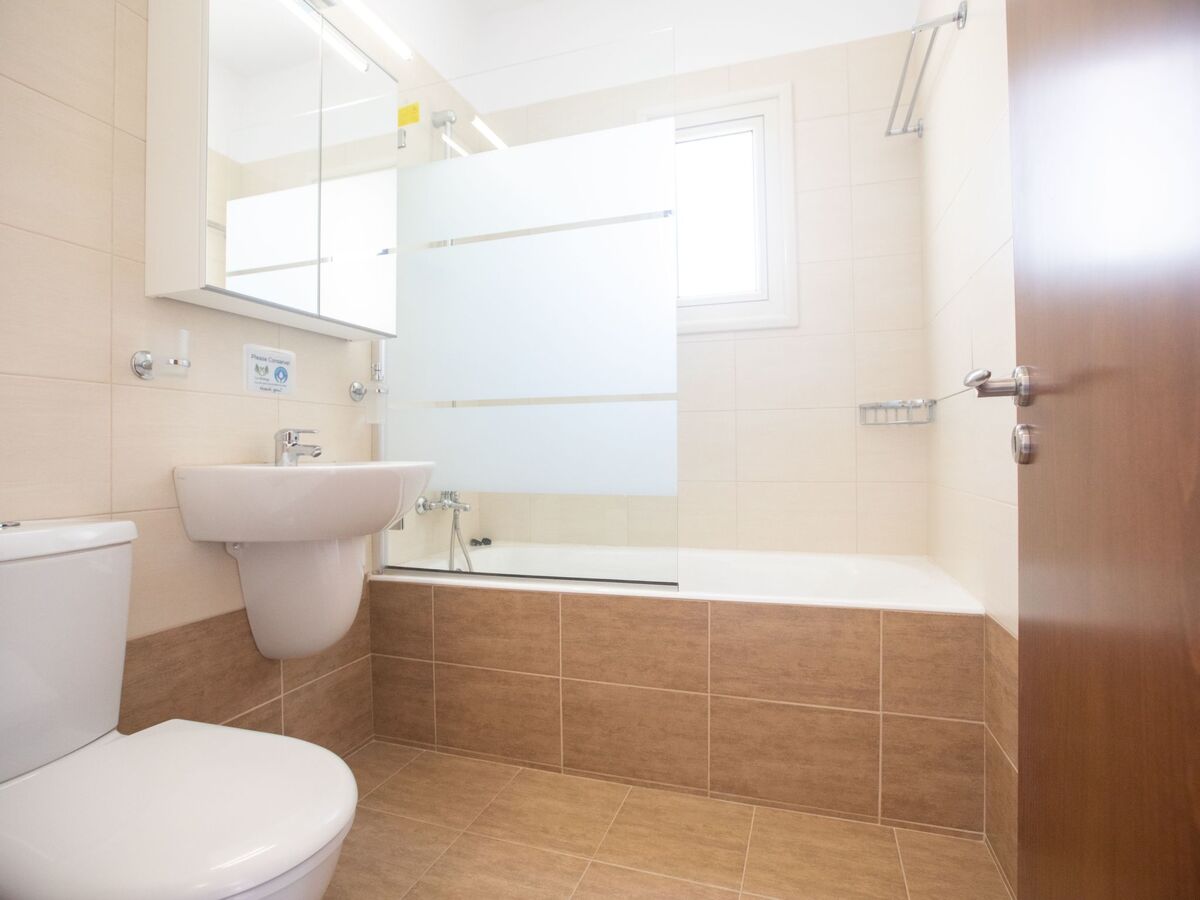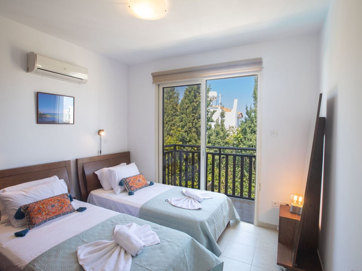 The master bedroom has an en-suite bathroom with shower and WC, double bed and balcony, and bedroom 2 has two single beds and balcony.