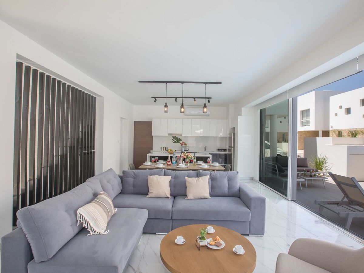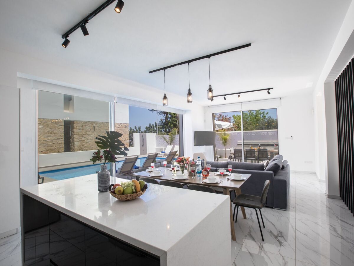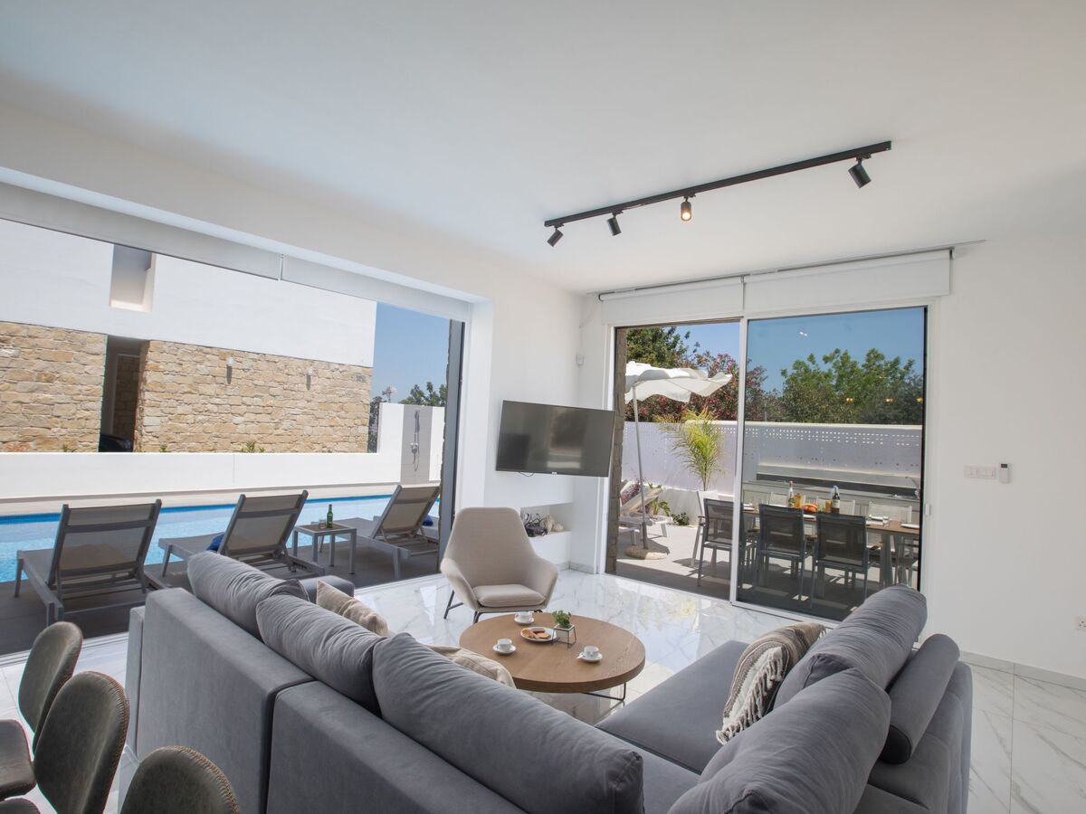 As you enter the villa, you will find the contemporary open-plan living room, kitchen and dining area surrounded by large patio doors leading to the garden and pool area.
