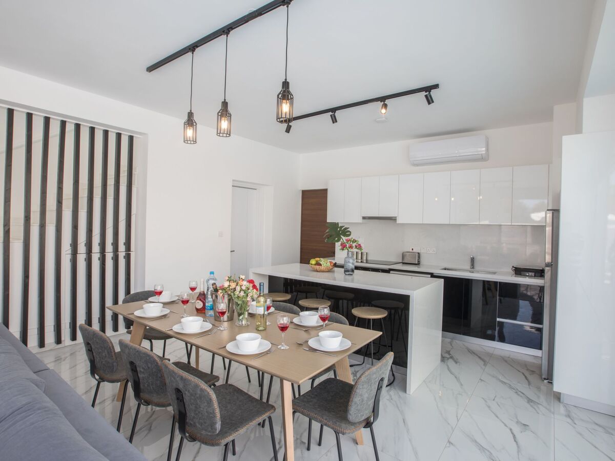 The dining area has seating for 8 persons and the modern kitchen is fully equipped with all appliances needed for your self-catering stay and also includes a breakfast bar with extra seating for 3 persons.