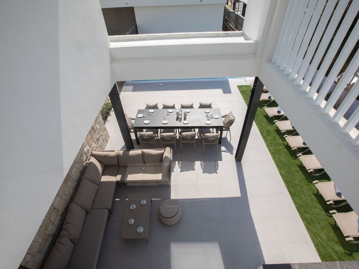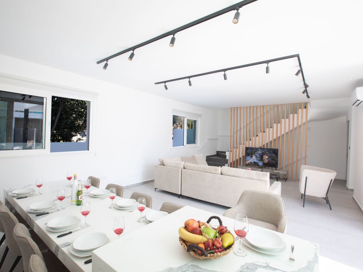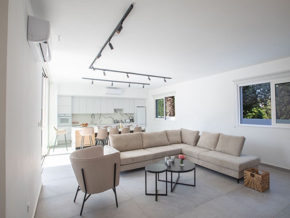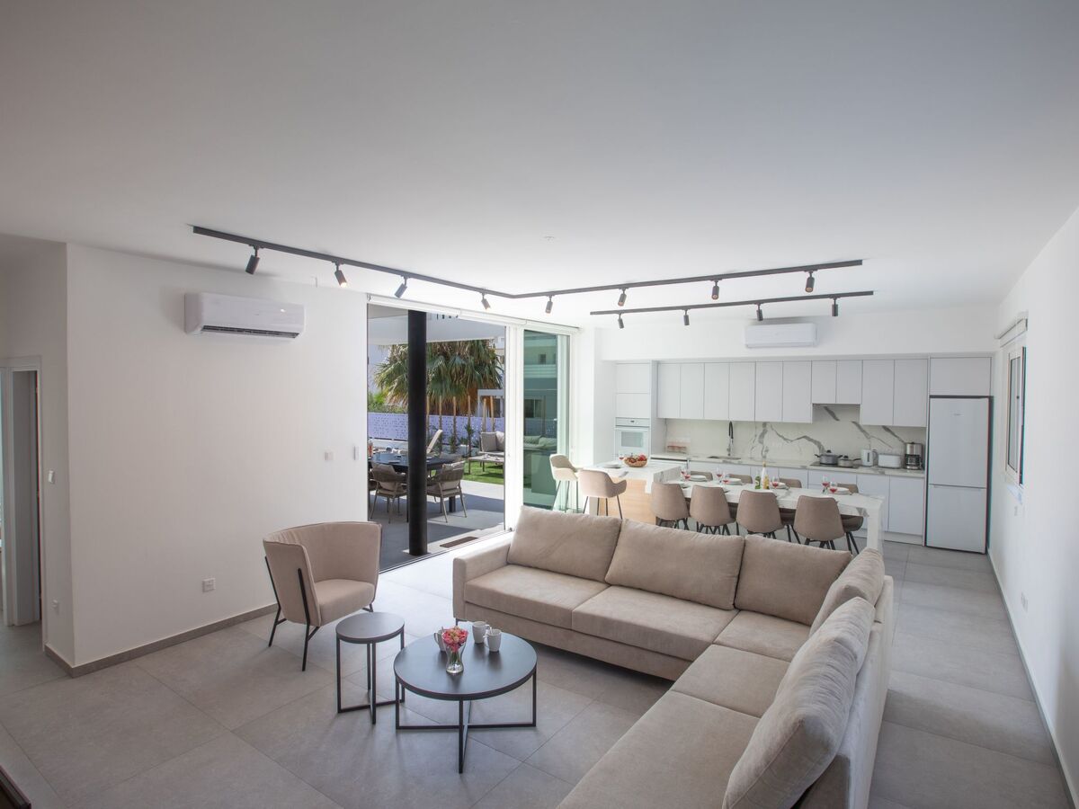 As you enter the villa, you will find the spacious, and very modern open-plan living room, kitchen and dining area, with large patio doors leading to the garden and pool.