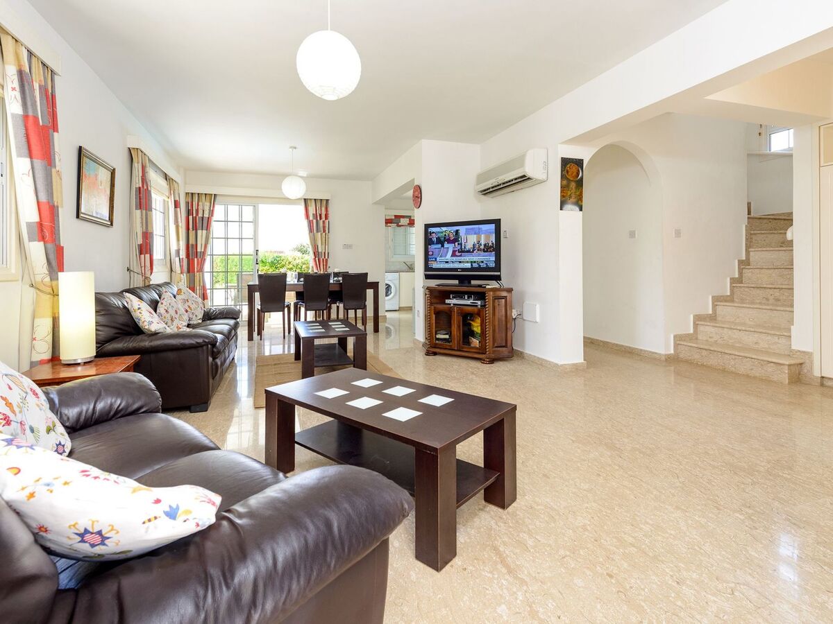 The villa has an open-plan living and dining area, with widescreen TV and comfortable seating.