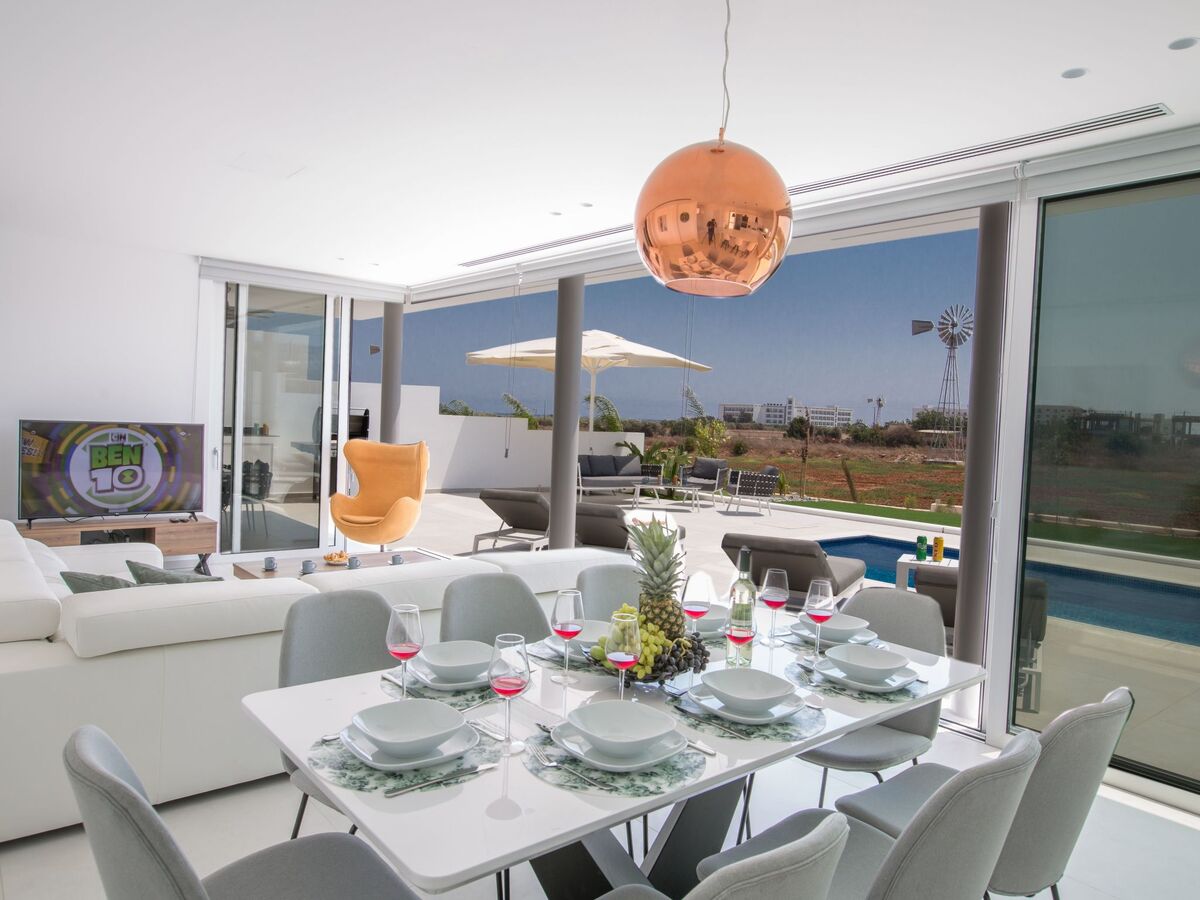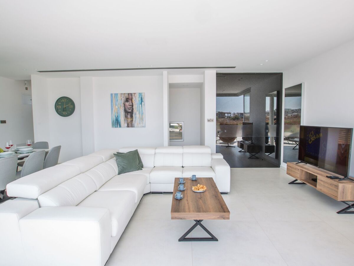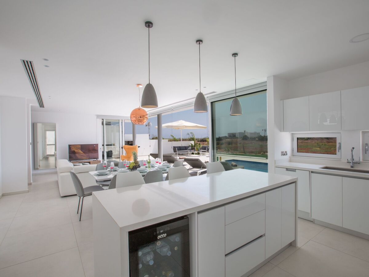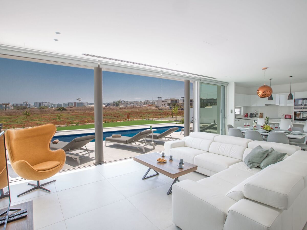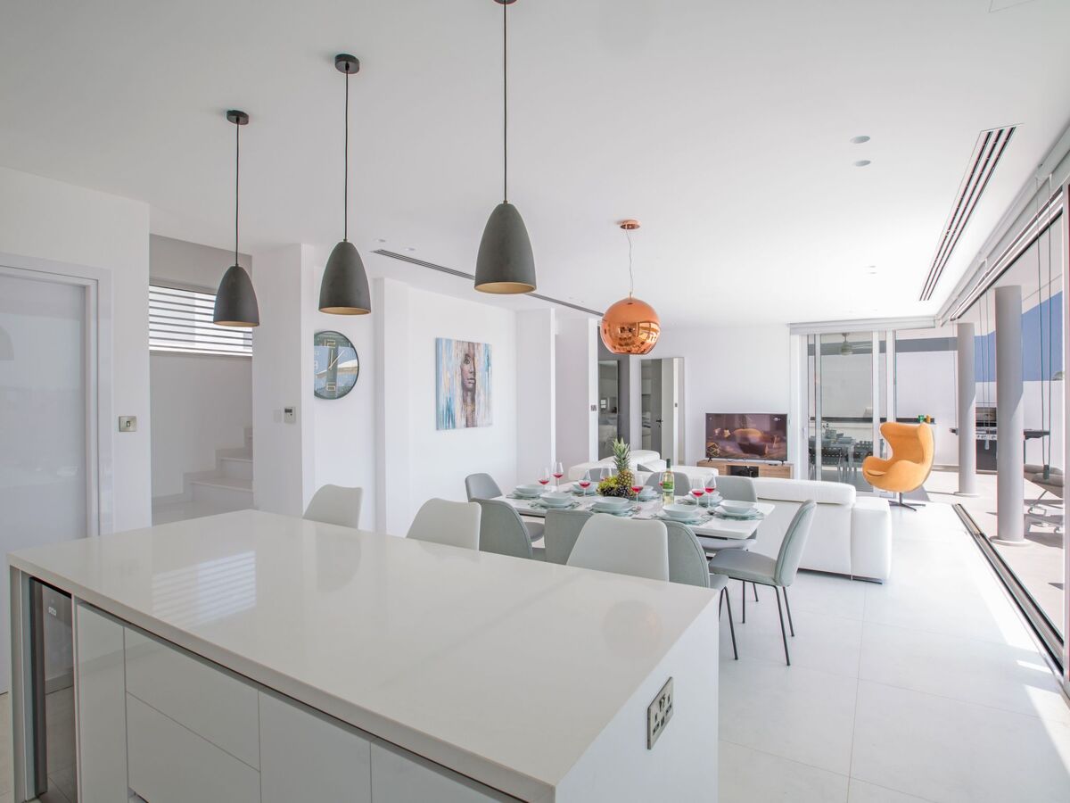As you walk in to the villa, you will find the open-plan living room, kitchen and dining area.