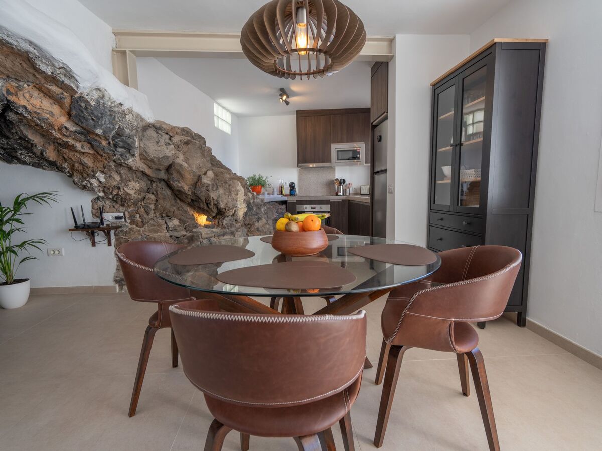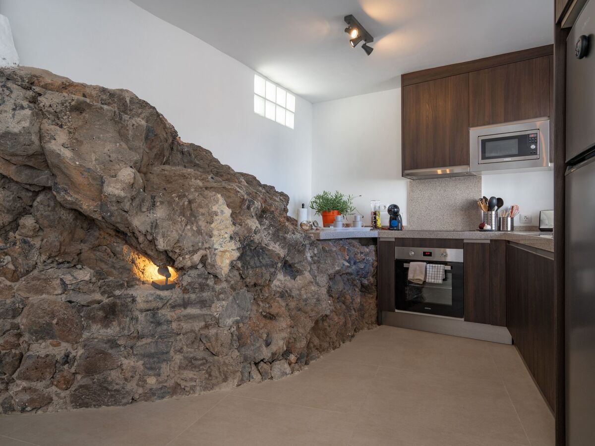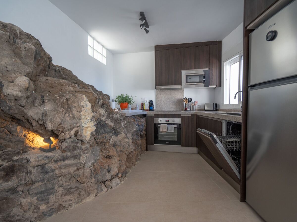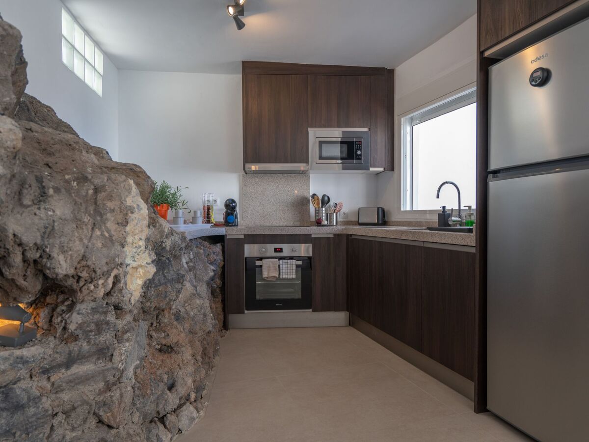 Immediately you realise that you have not booked a normal house: you are in a cave! Volcanic rocks shape the kitchen which partly uses real rocks as a worktop.