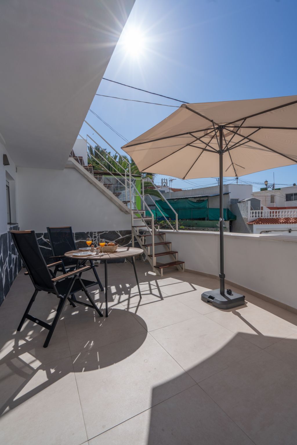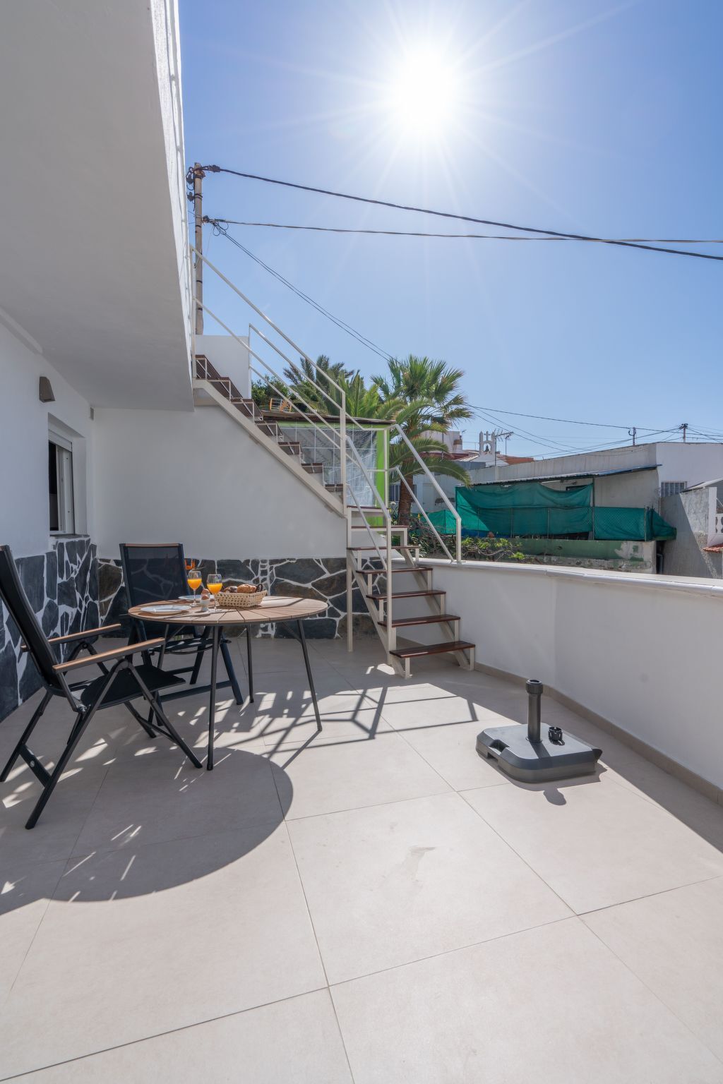 From the ground floor terrace, you can climb the stairs to the 40 m2 roof terrace where you have sun all day long.