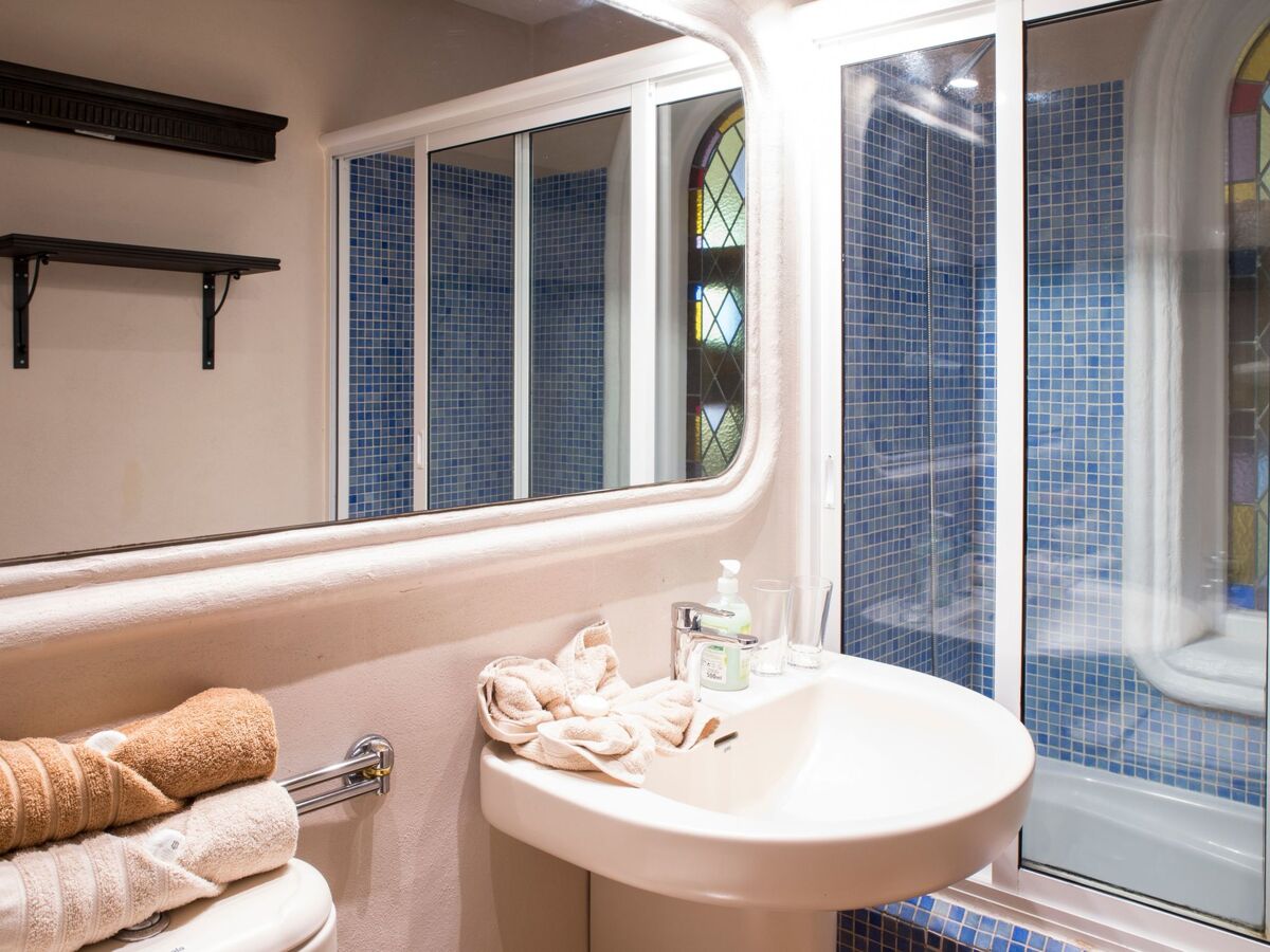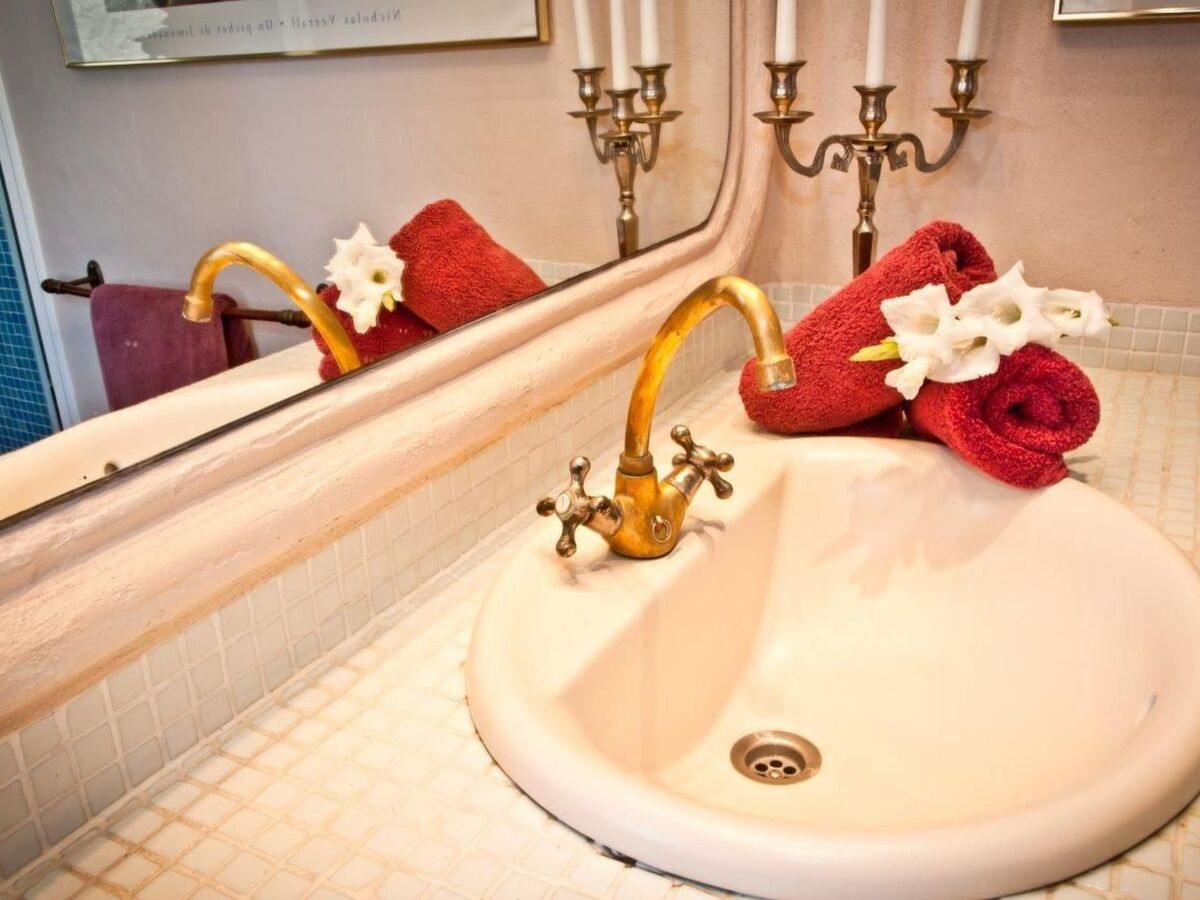 Right next door, in the wine cellar so to speak, there is a small bathroom with a rustic-style bath and WC.