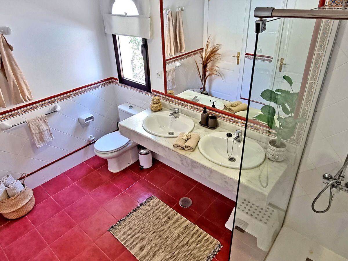 The garden with lots of greenery and its own palm trees, built-in barbecue, seating, sun loungers, a comfortable hanging chair and the heated swimming pool invites you to spend great holidays here, as well as to relax and play.