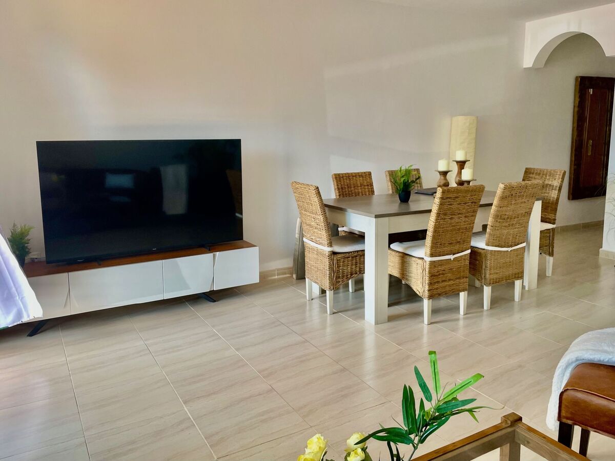 - A living room with 65" SmartTV (satellite TV), couch and a dining area