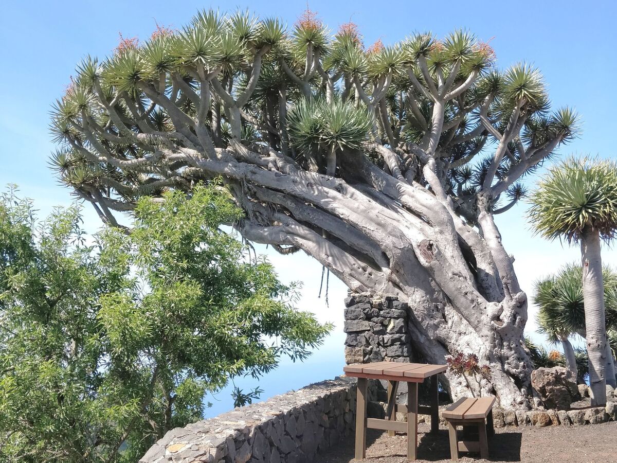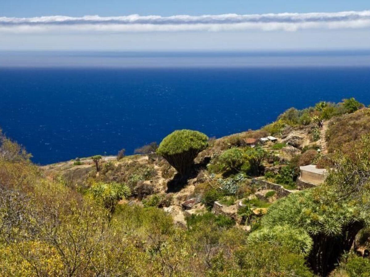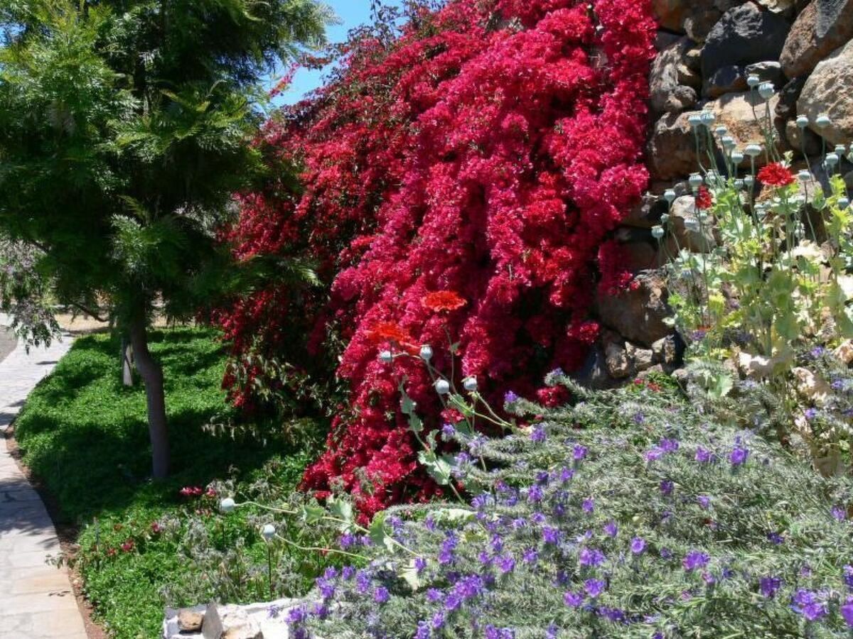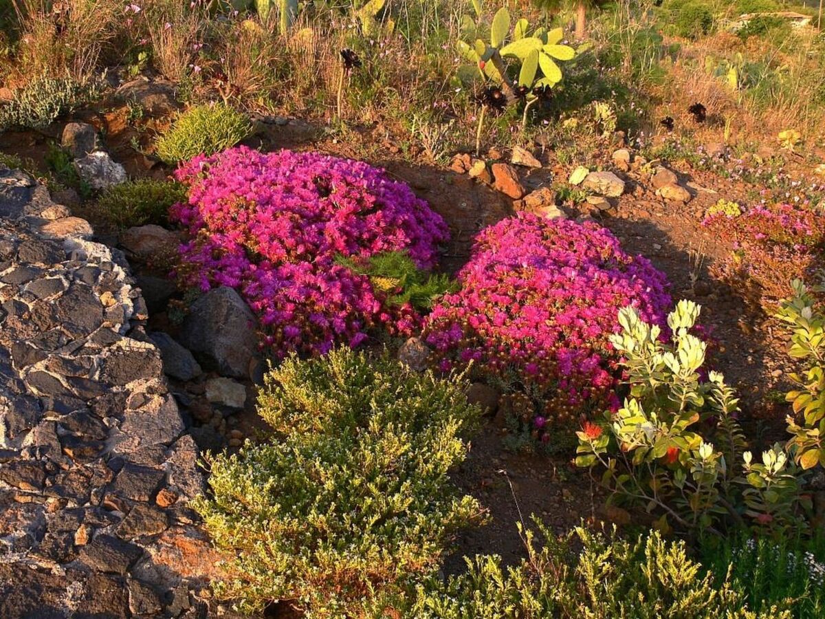 2 terrasses avec salon de jardin, chaises longues et parasols, jardin de pierre japonais, coin d'herbe dans le jardin avec l'origan, le basilic, le thym, la marjolaine, le Sabai; jardin subtropical, pelouse, Opuntia écologiquement précieuse (de figue de Barbarie), la terre des déchets non traités avec le pin des Canaries et d'amandiers, parking en face de la maison.