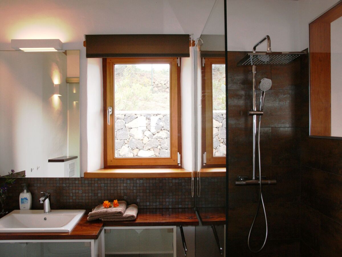 The bathroom impresses with a modern, floor-to-ceiling glass shower with rainwater shower head and fantastic sea views beyond the window to the bedroom.