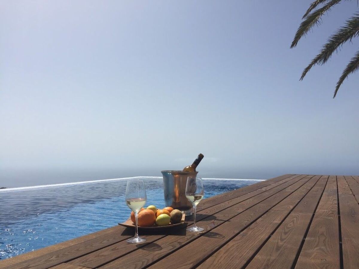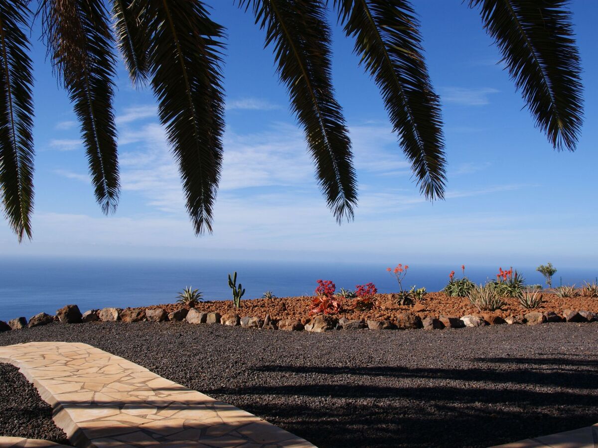 The beautiful outdoor area under the large Canarian palm tree consists of several terraces with different seating options and a 180-degree view of the glittering sea, framed by the flowering tropical plants.
