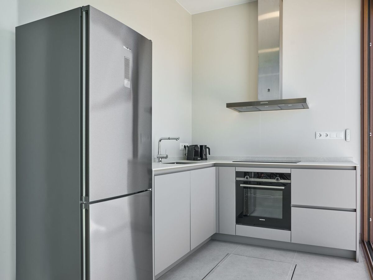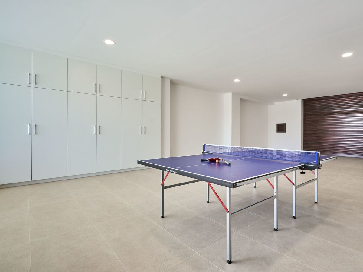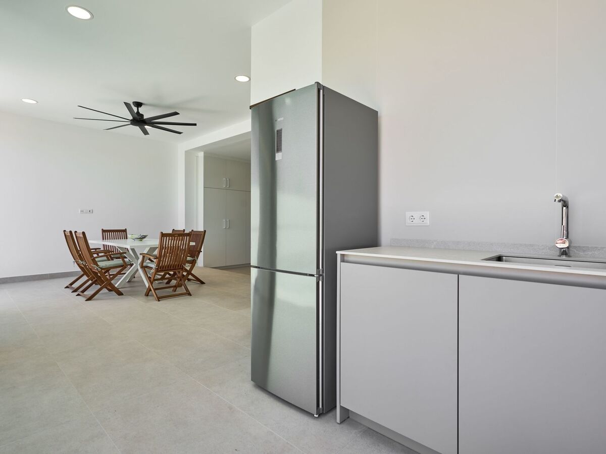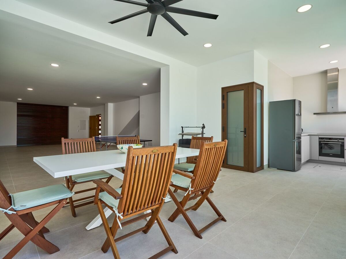 From the garage there is access to the back of the house where there is a porch with ceiling fan that houses an additional kitchen with dishwasher, ceramic hob, sink and large fridge.