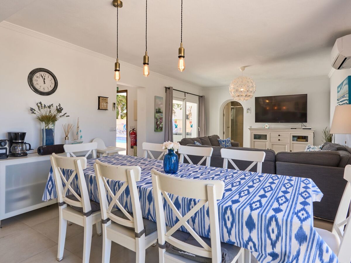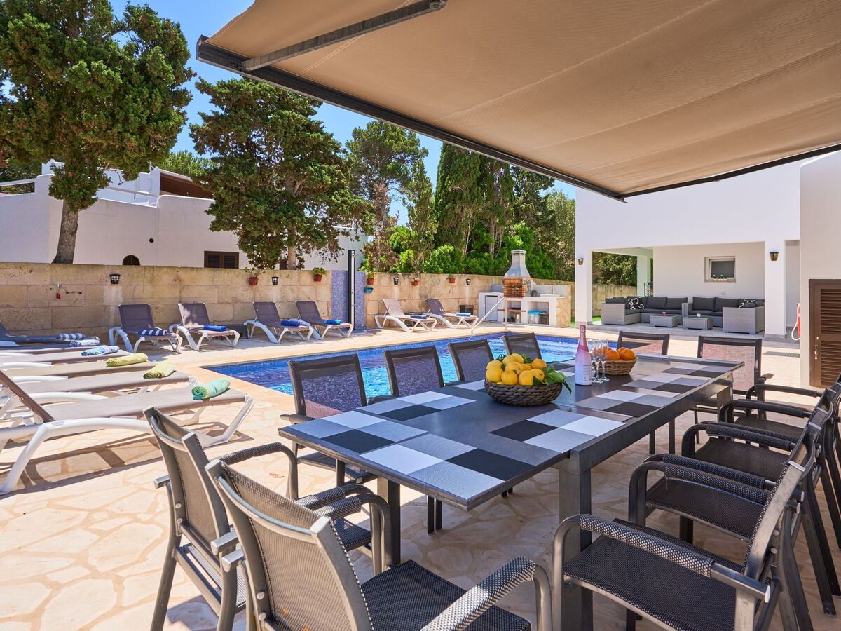 Next to the pool there is a dining area with a large awning.