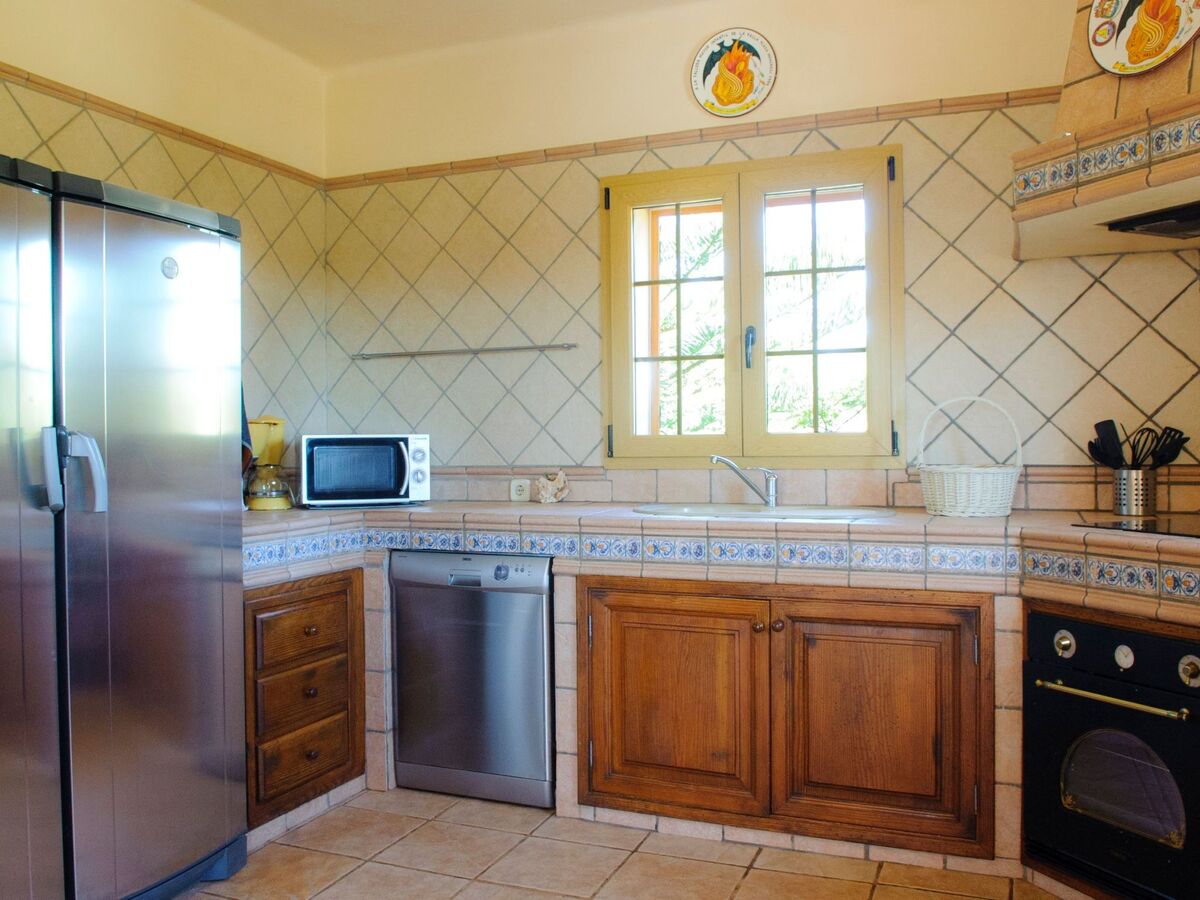 The kitchen is fully equipped and an archway leads to the dining area with views of the terraces and the pool.