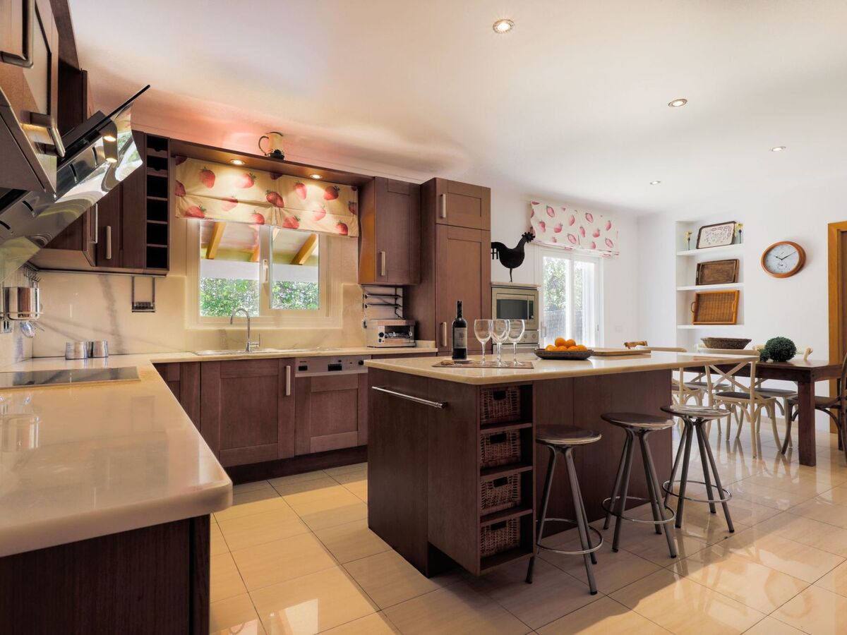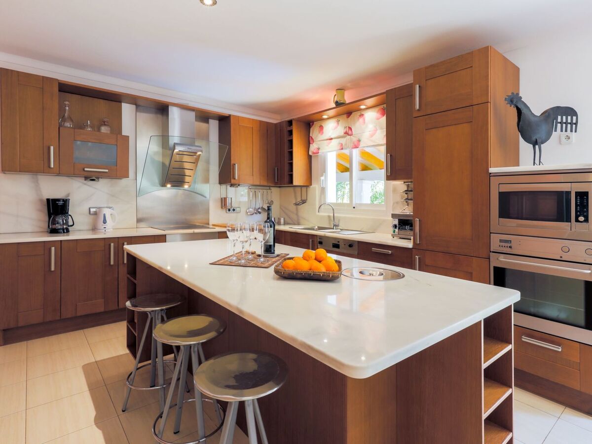 The modern kitchen with a large cooking island is equipped to a high standard and also offers ample seating.