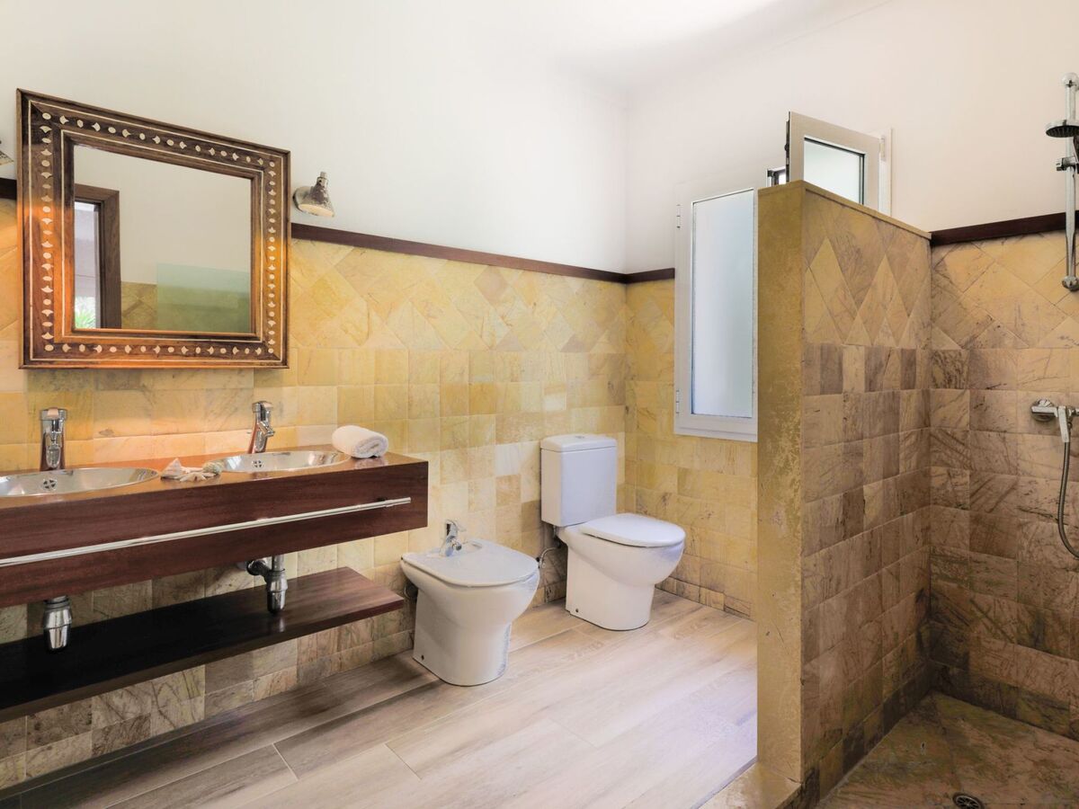 A bedroom with two single beds as well as a full bathroom (shower and bath) en suite and access to the outside area complete the ground floor.