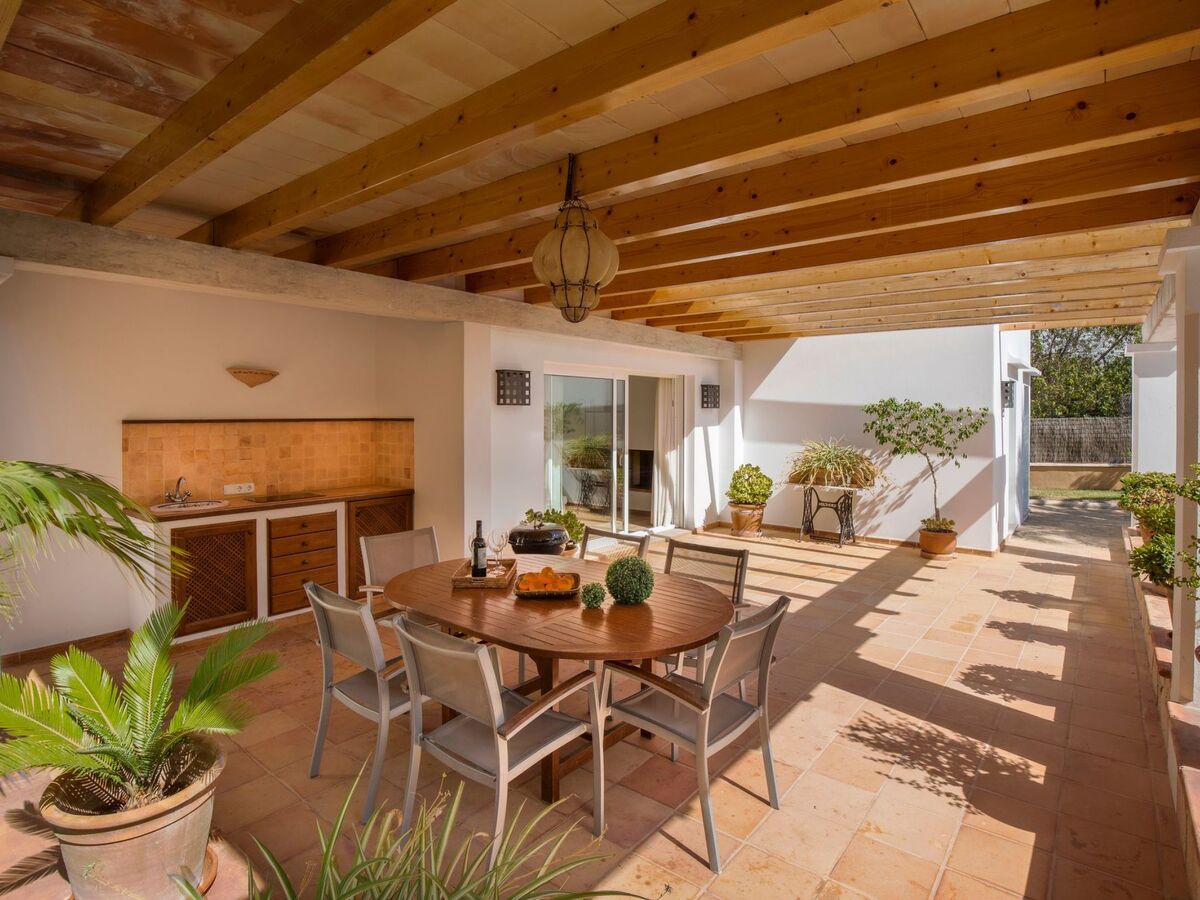 Large sliding glass doors lead out onto the covered terrace, which is furnished with beautiful wooden outdoor furniture.