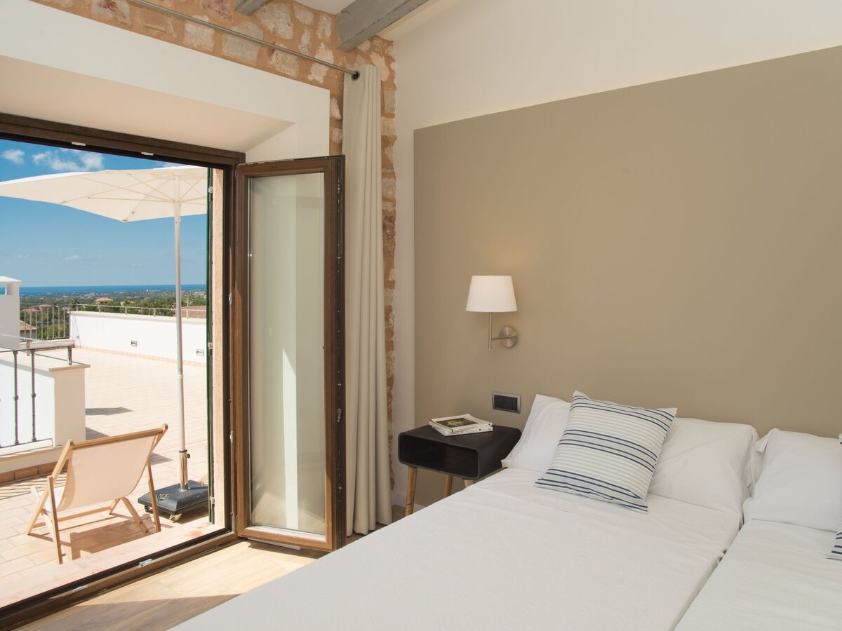 Ici se trouvent trois autres chambres à coucher, chacune avec deux lits simples et une salle de douche en suite ainsi qu'un accès à une terrasse avec des chaises longues et des parasols, l'endroit parfait pour se détendre et profiter de la vue sur la campagne et la mer au loin.