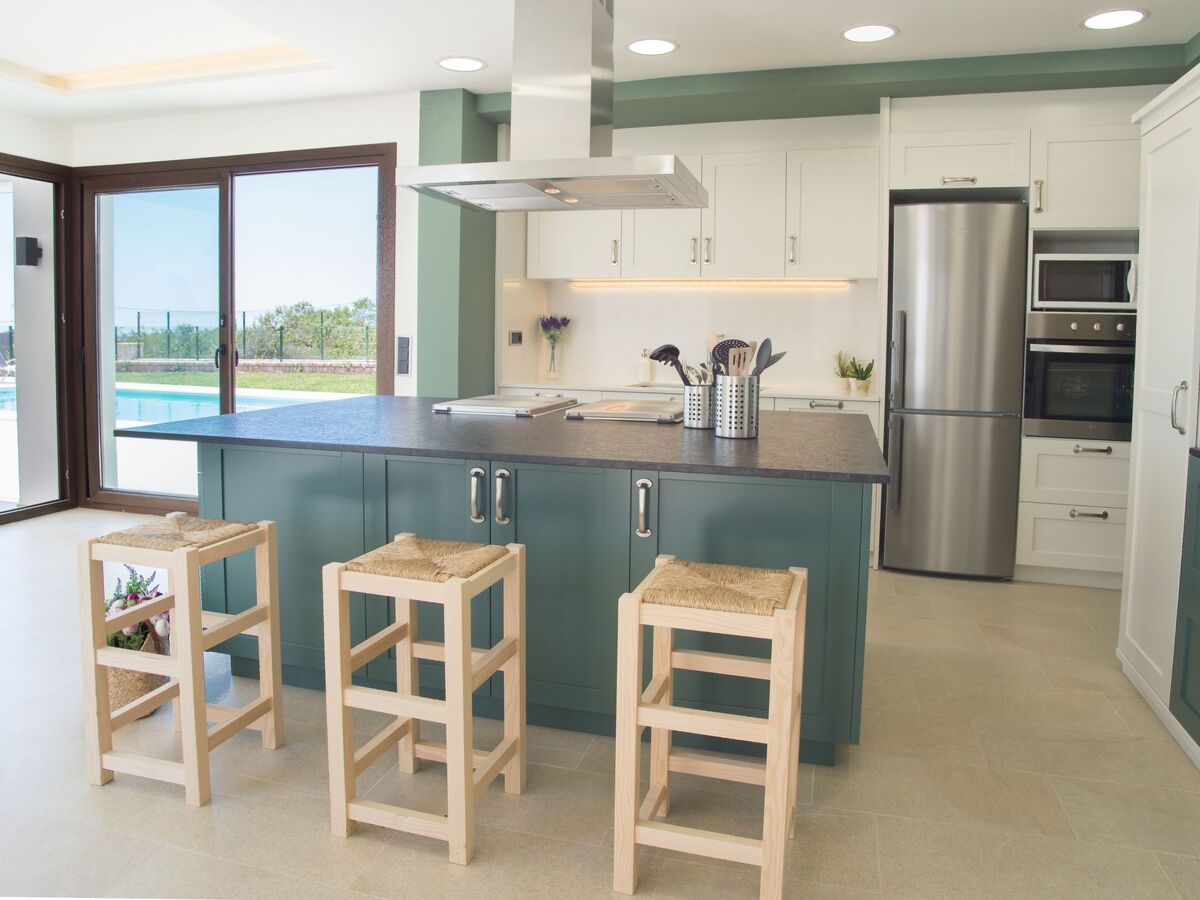 Des meubles et une décoration modernes se combinent avec goût à de hauts plafonds avec des poutres en béton apparentes et certains murs recouverts de pierres sèches, ce qui donne à la maison une ambiance rustique.