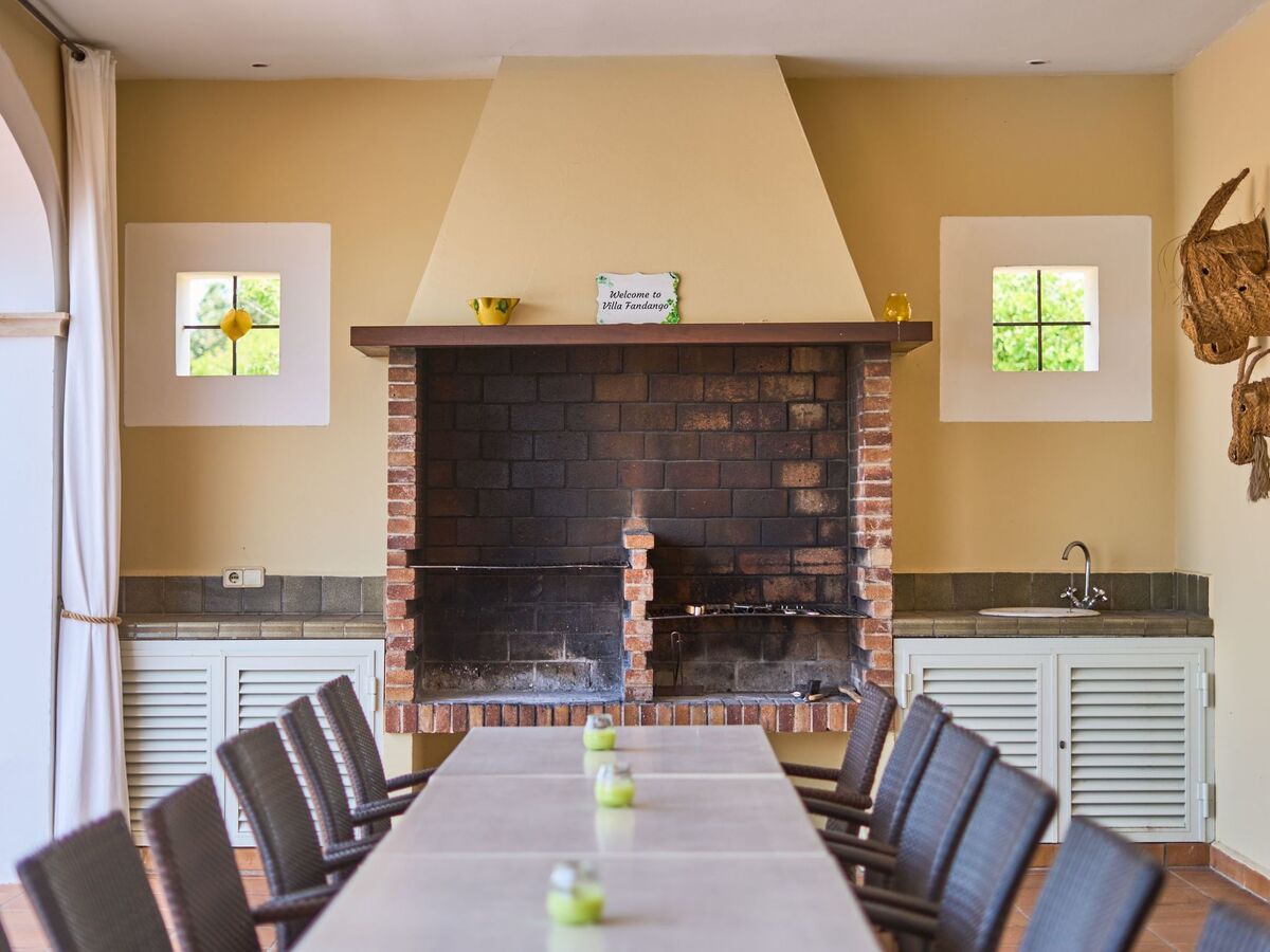Covered terrace with dining area and brick barbecue.