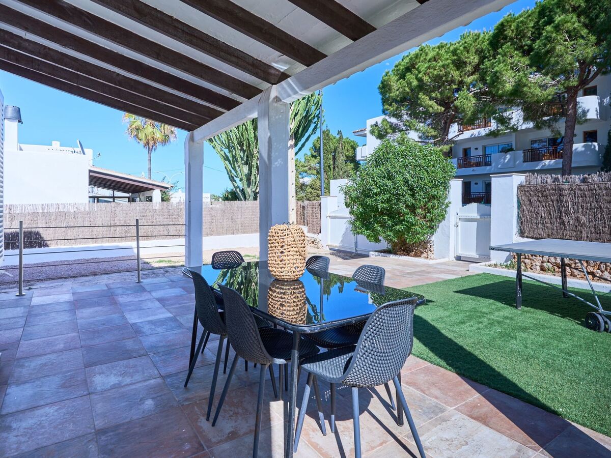 A pergola with another dining table and a charcoal barbecue round off this area.