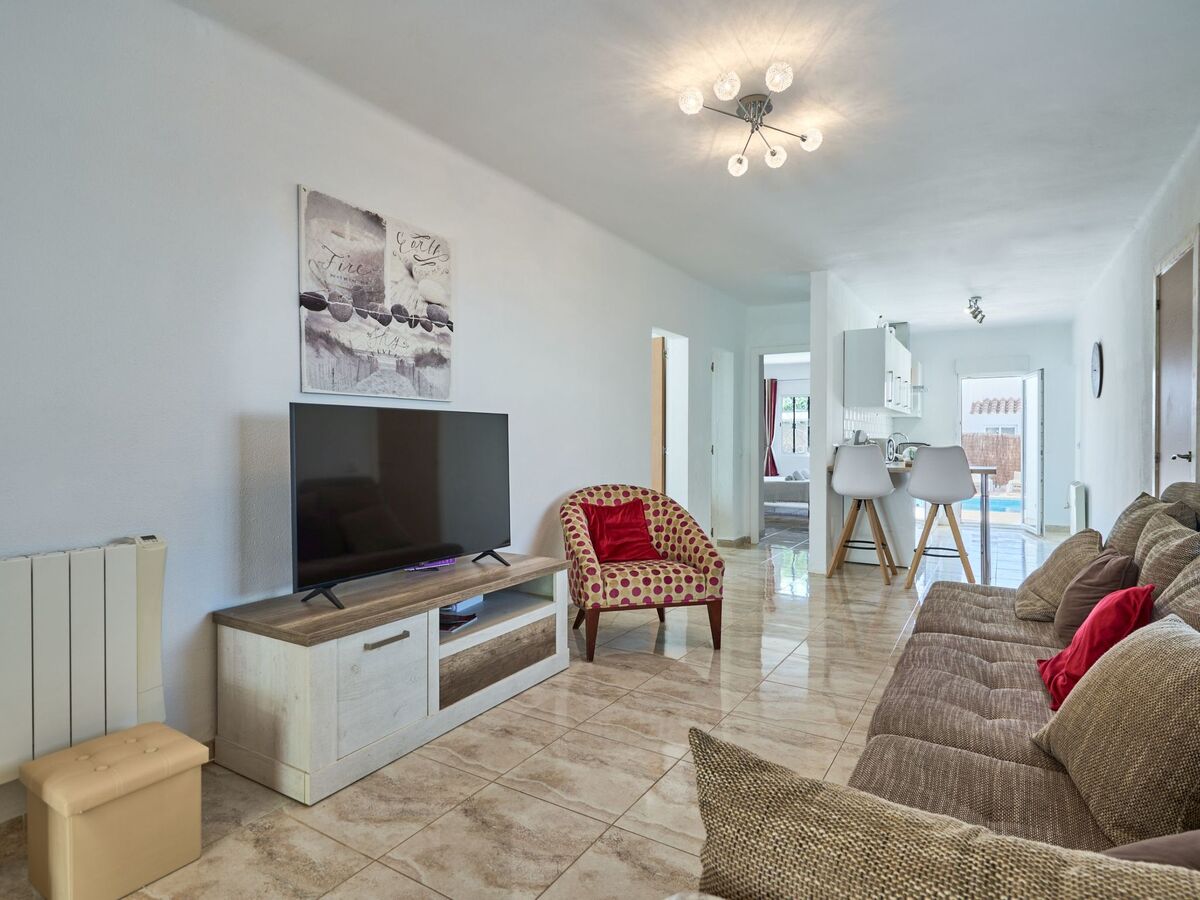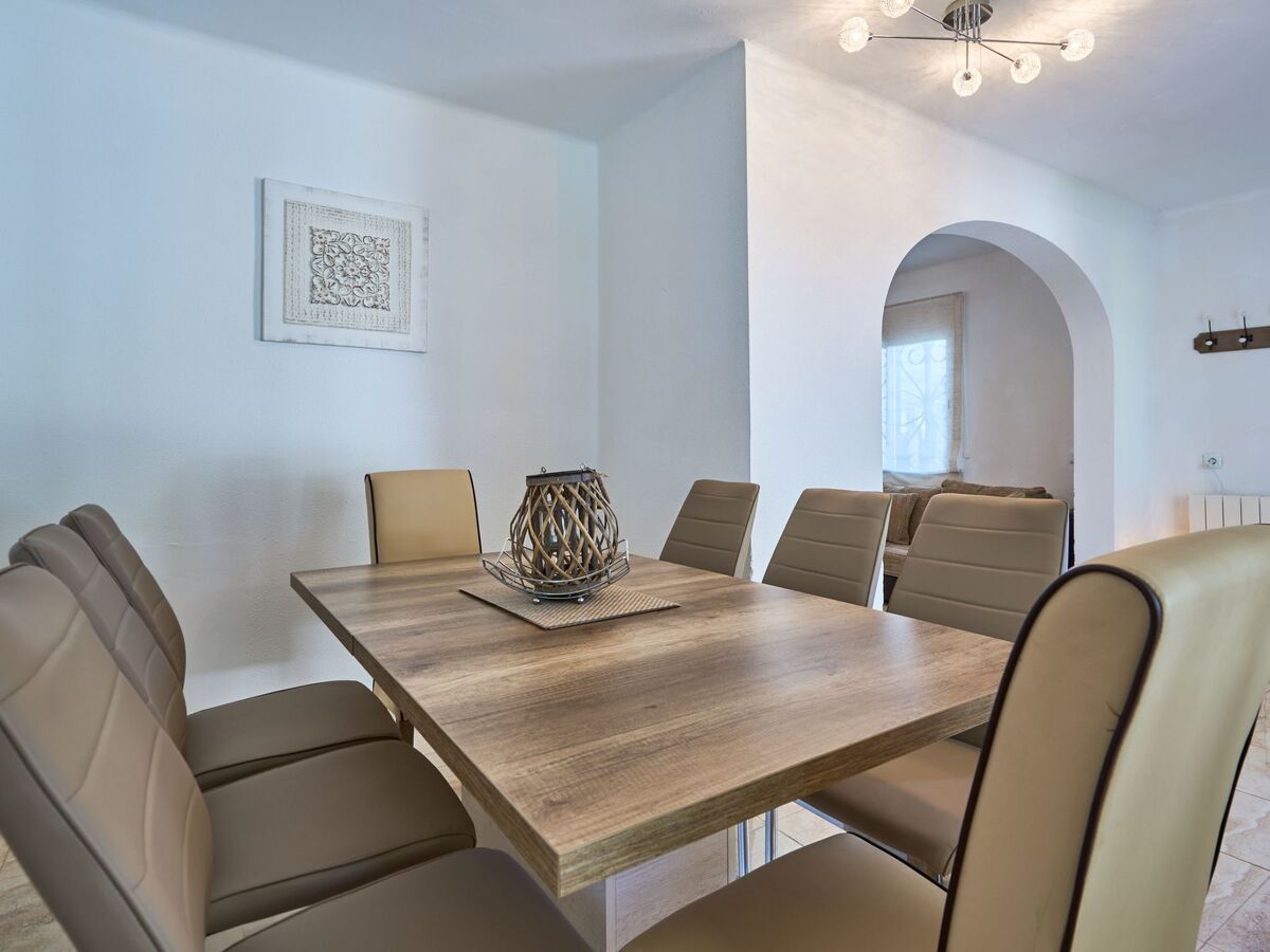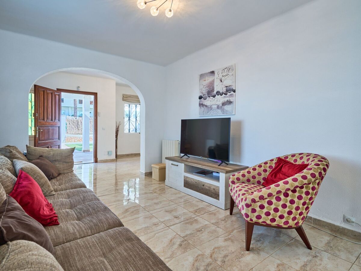 Directly from the entrance of the house we find an open space with the dining table on the left, the living area with Smart TV and the directly adjacent open-plan kitchenette.