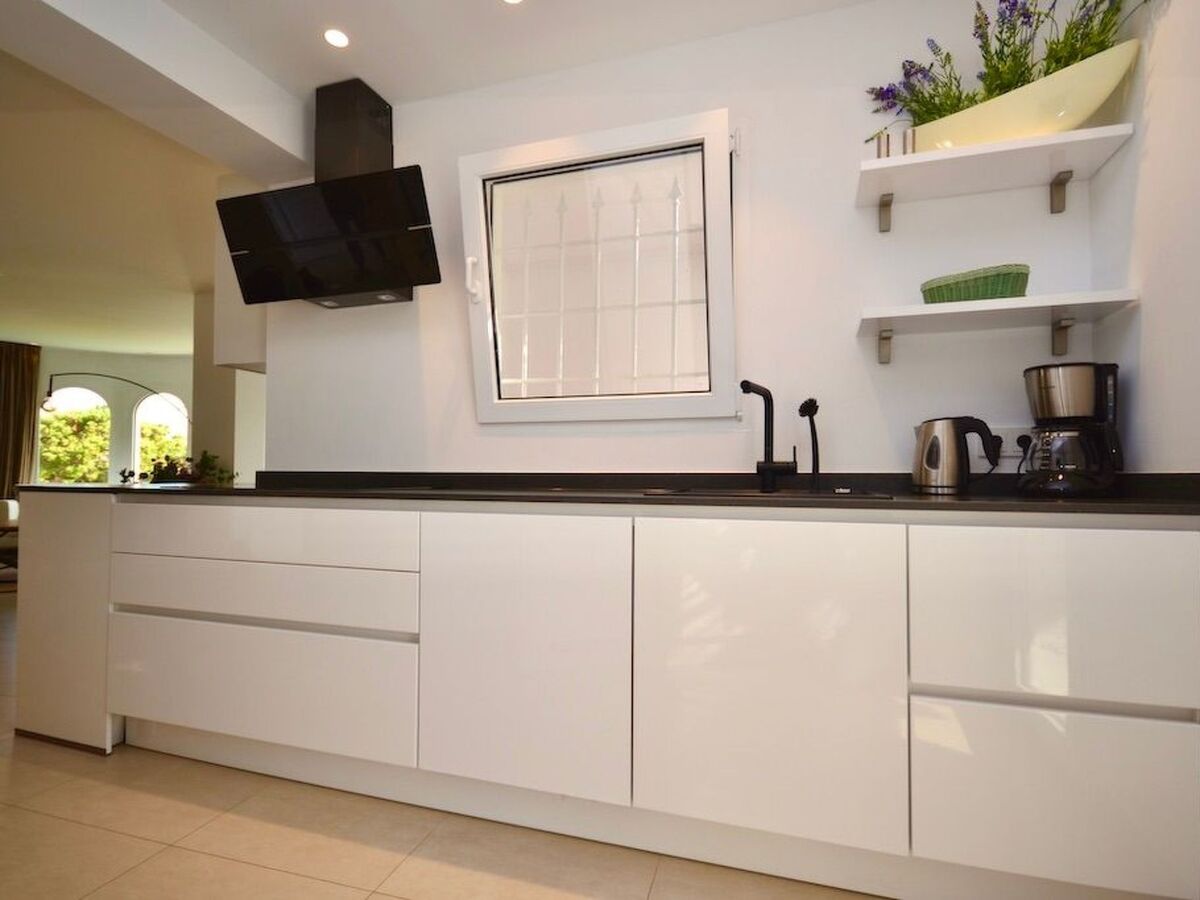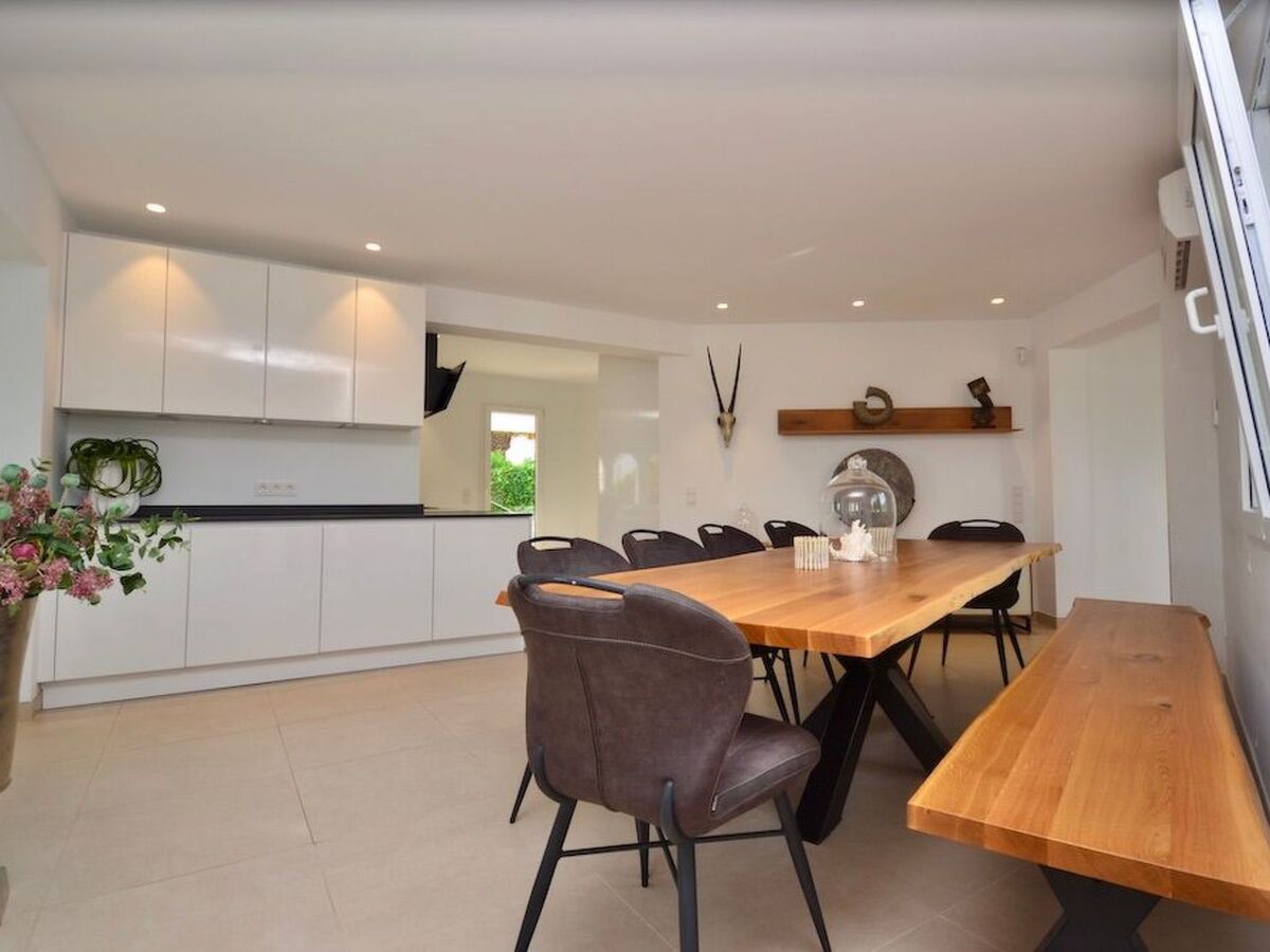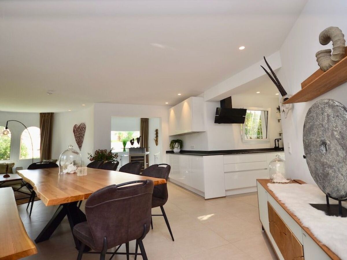 Le salon et la cuisine élégamment intégrée donnent accès à la piscine.