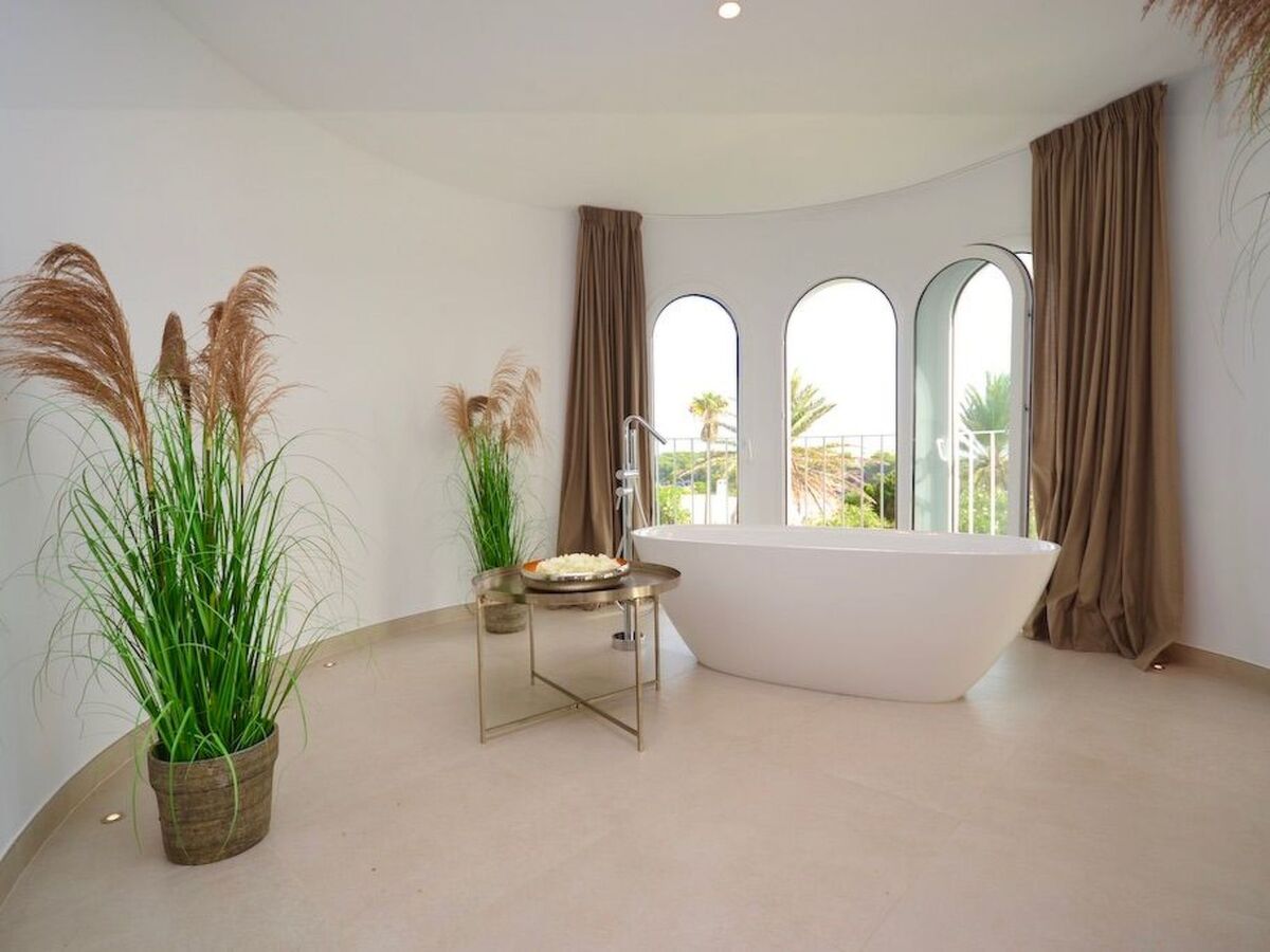Nous entrons dans la chambre à coucher principale, lumineuse et spacieuse, qui offre une vue partielle sur la mer via la baie semi-circulaire avec baignoire moderne.