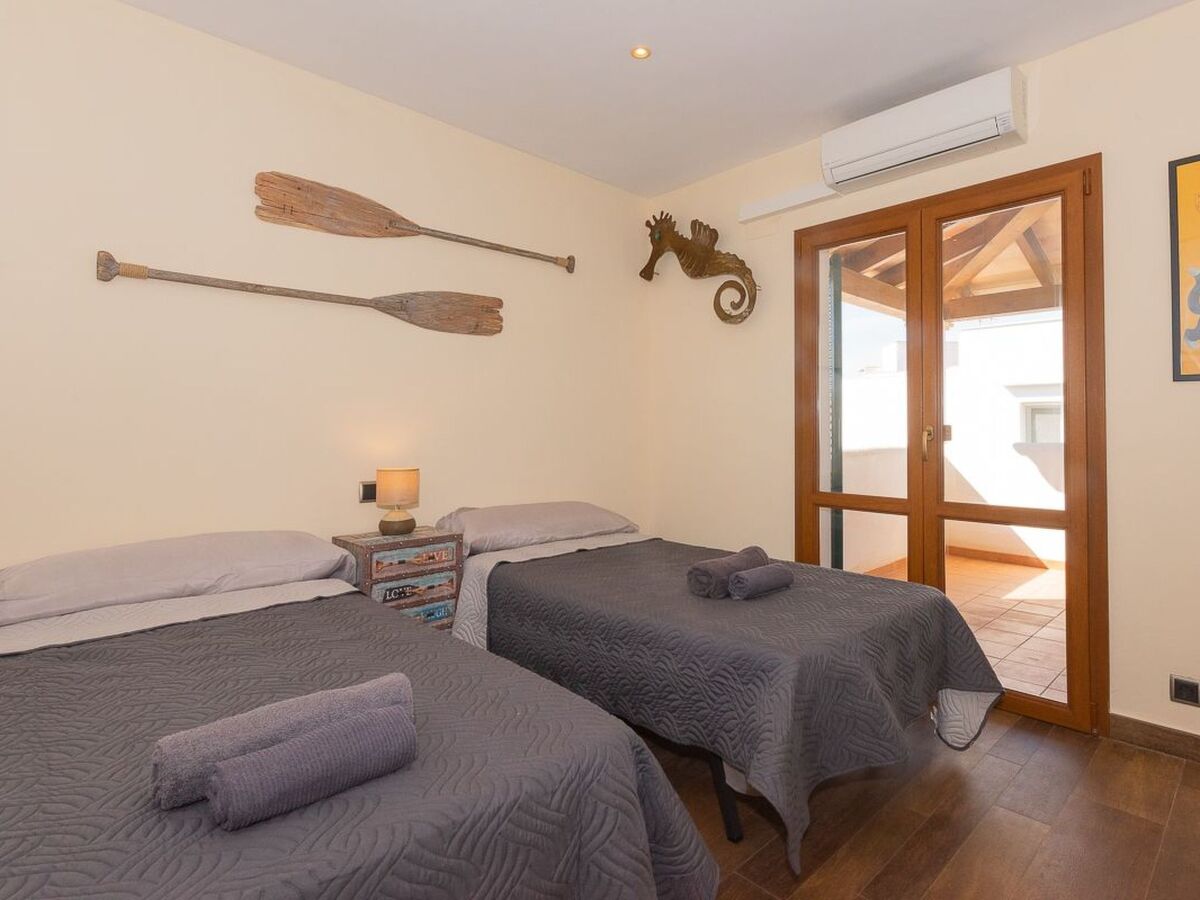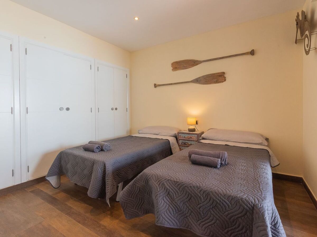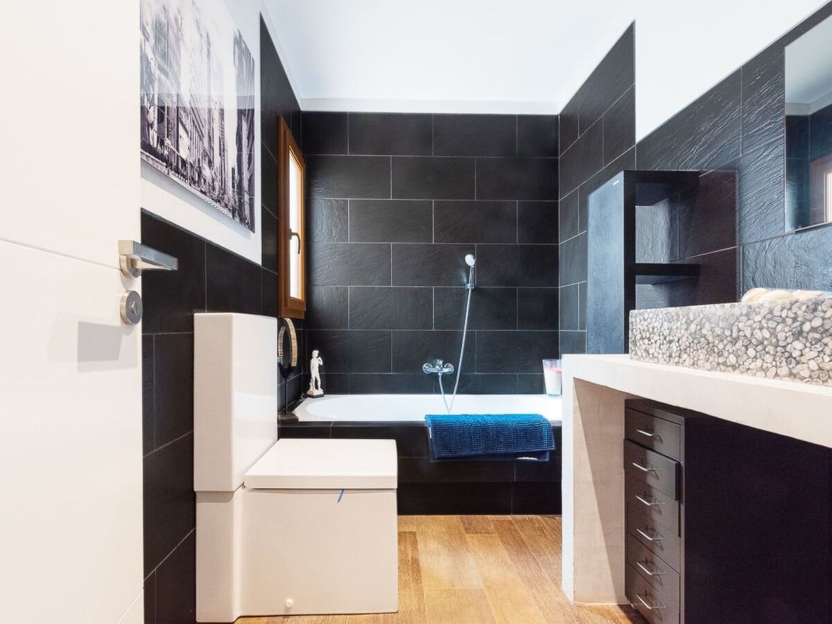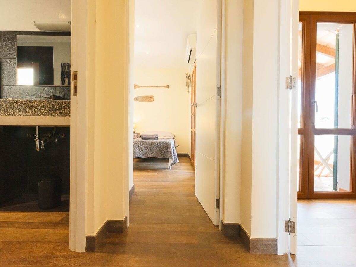 The other two bedrooms, one with a double bed and the other with two single beds, share a separate bathroom with bathtub and access to a small terrace overlooking the garden.
