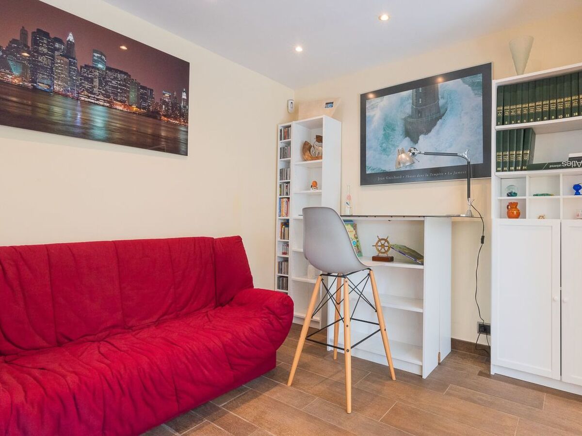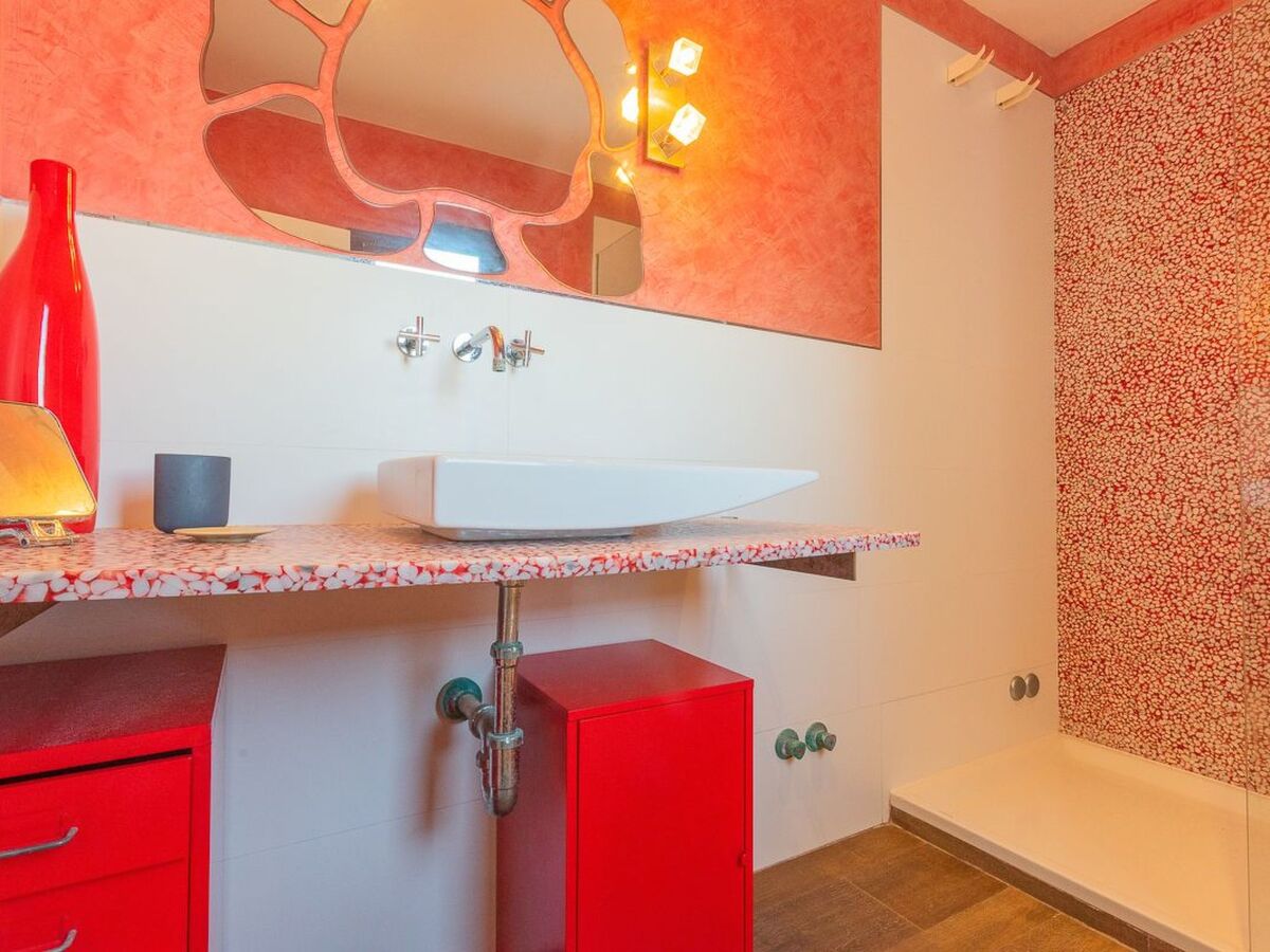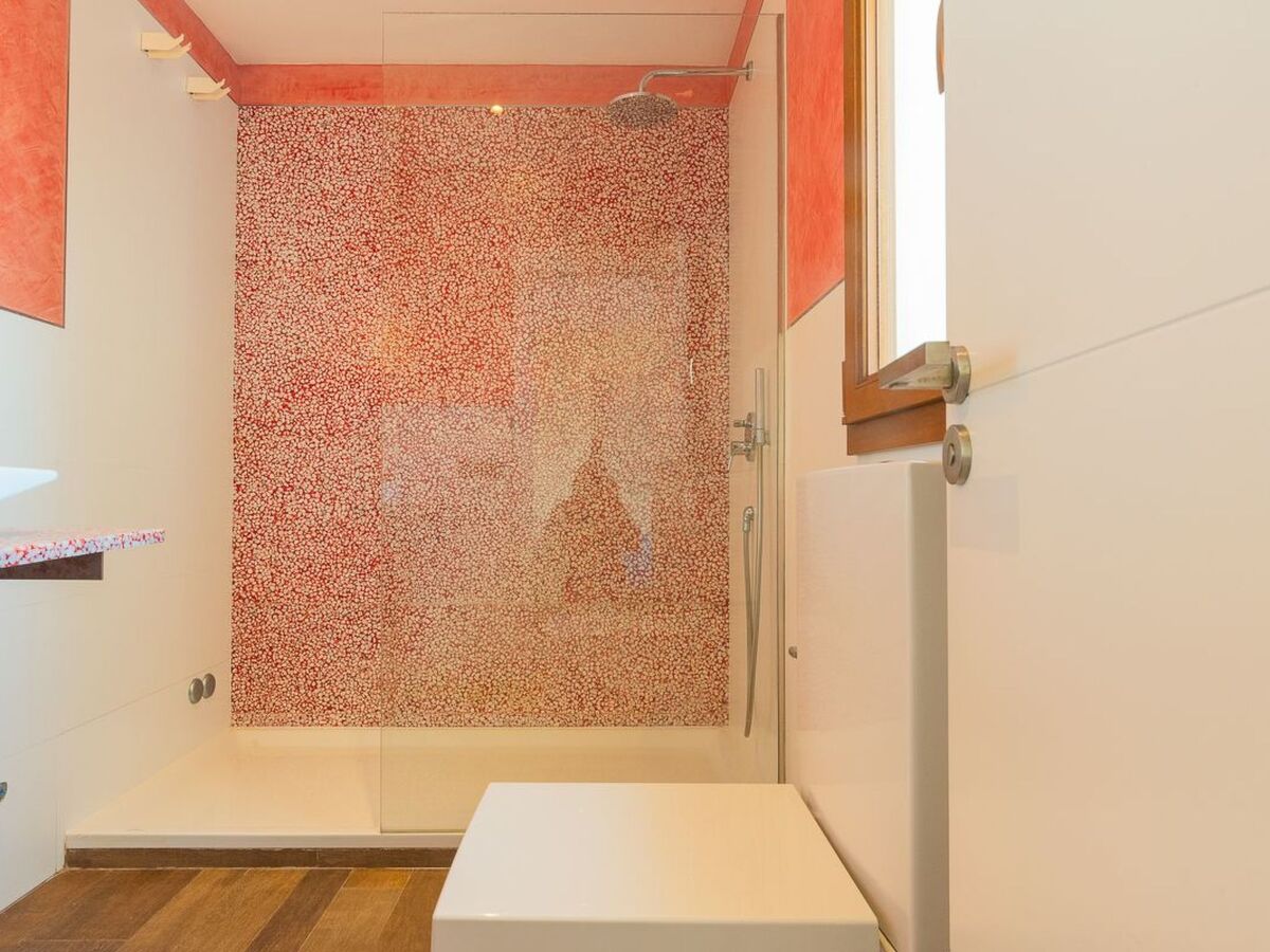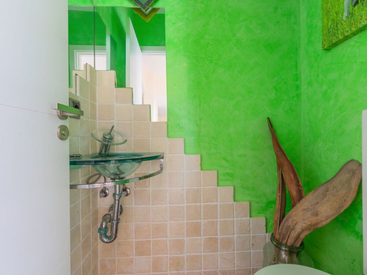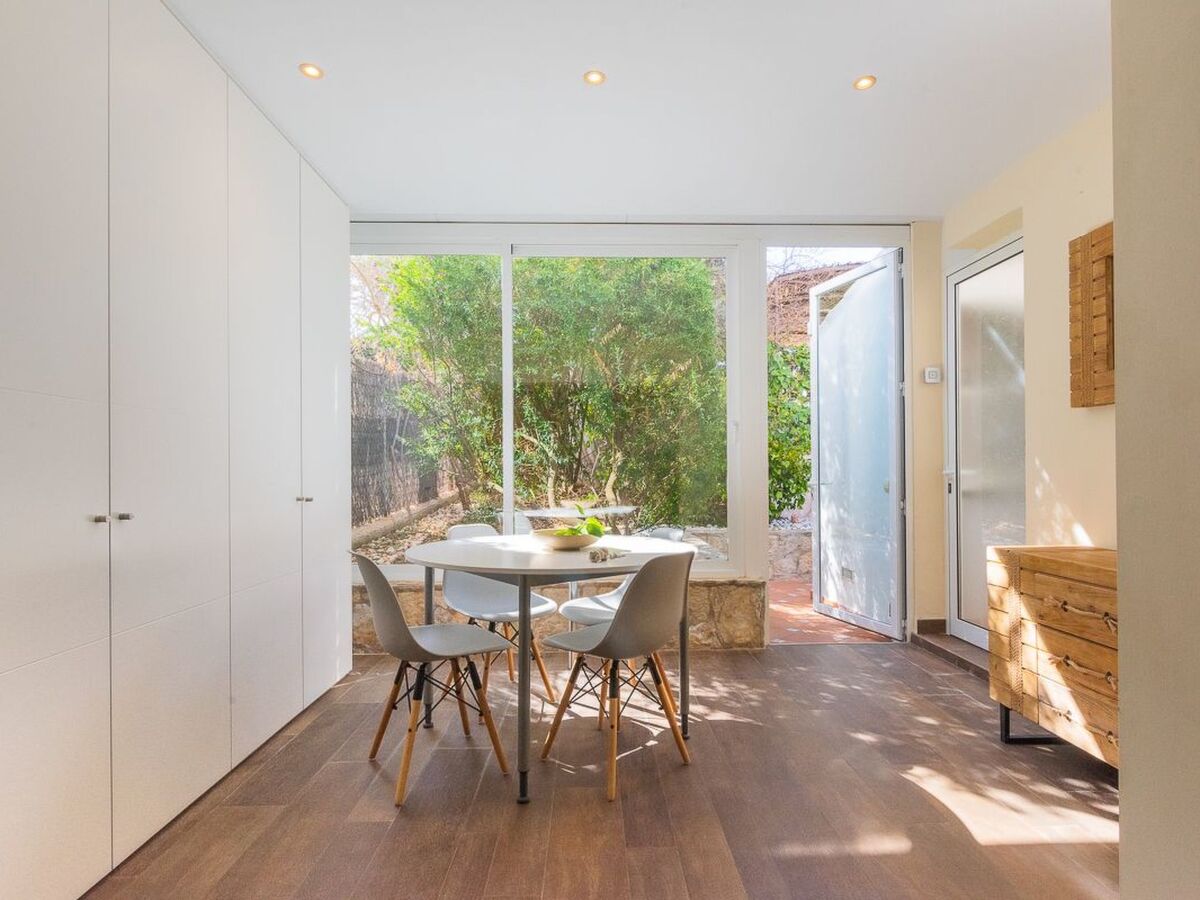 The other two bedrooms, one with a double bed and the other with two single beds, share a separate bathroom with bathtub and access to a small terrace overlooking the garden.