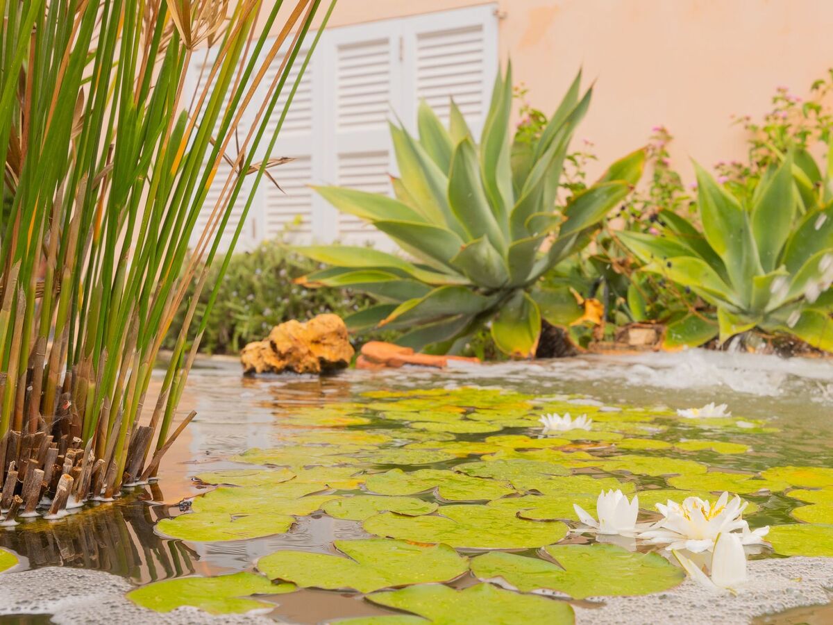 Beautiful outdoor area with a lovely lawned garden and a small pond, large pool with massage jets on the steps and a terrace that offers several areas to relax.