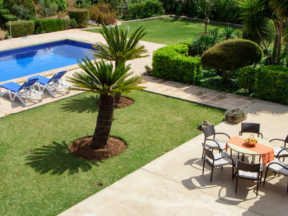 The outdoor area is magnificent, with a large pool area and a well-kept garden with lawn.
