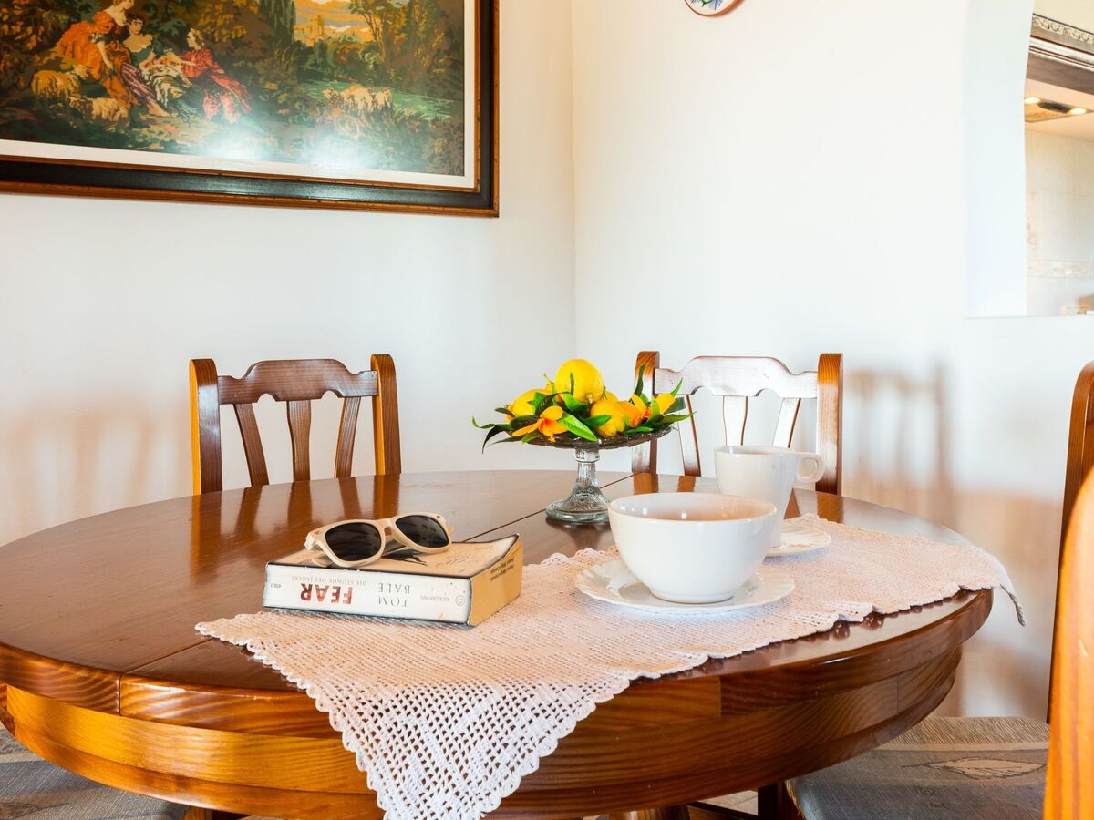 On the ground floor there is a hallway with open passageways to 2 dining areas, one with a fireplace, the other with an archway to the spacious kitchen, which is well equipped and has direct access to the covered terrace with dining table.