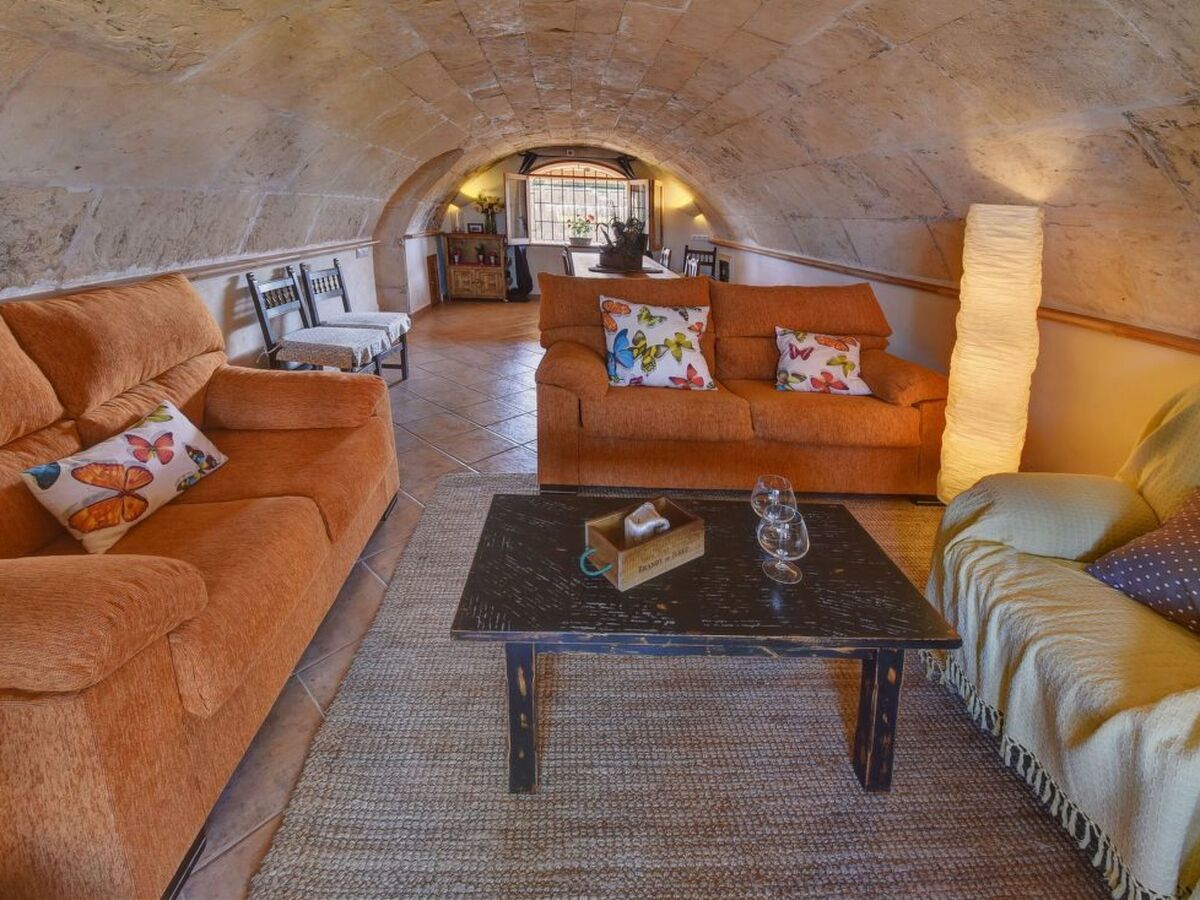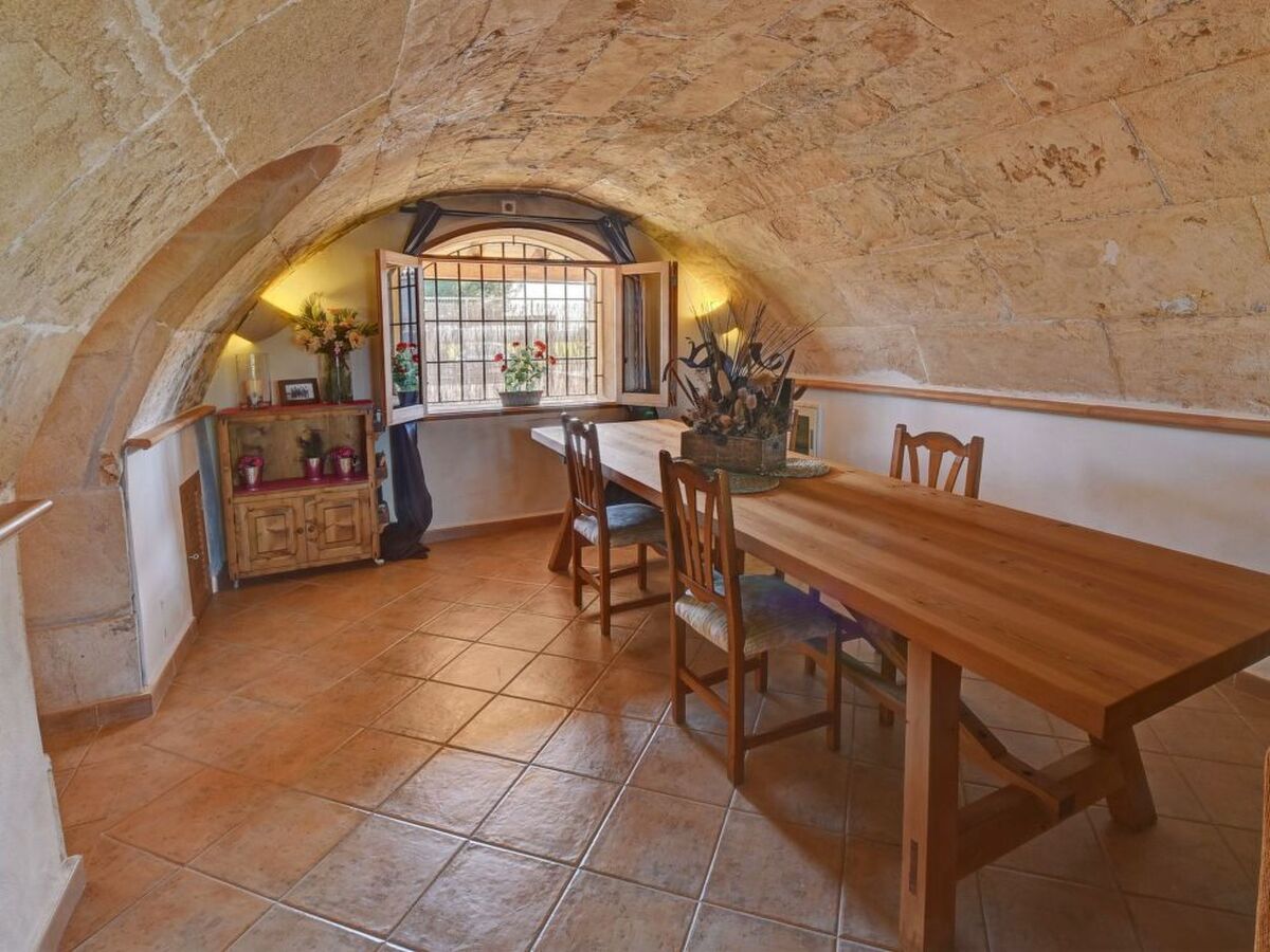 The living/dining area impresses with its beautiful arched stone ceiling.