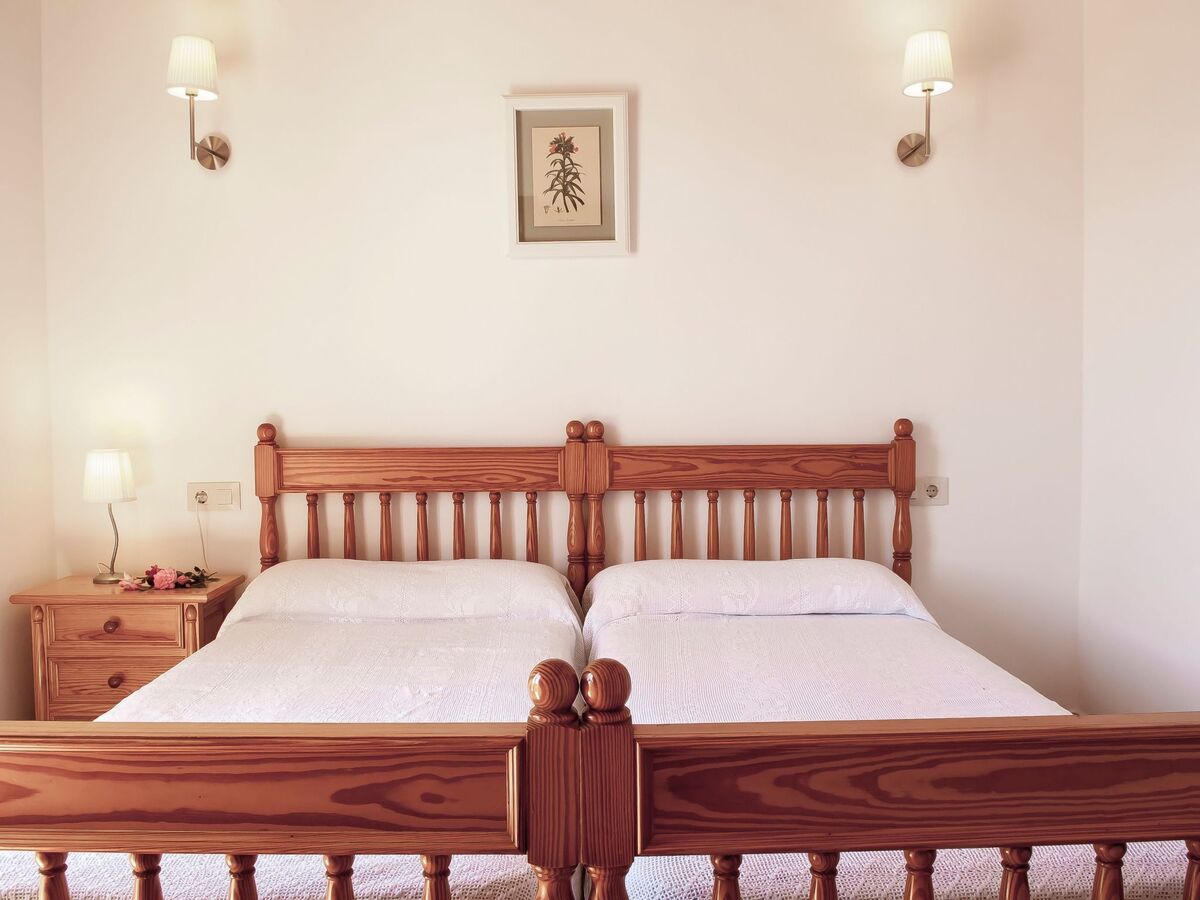 The upper floor has a double and a twin bedroom with views of the pool and the surrounding area.