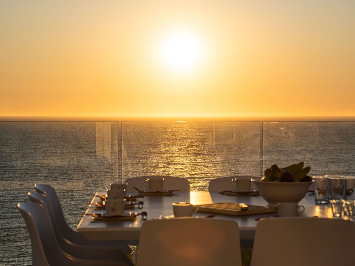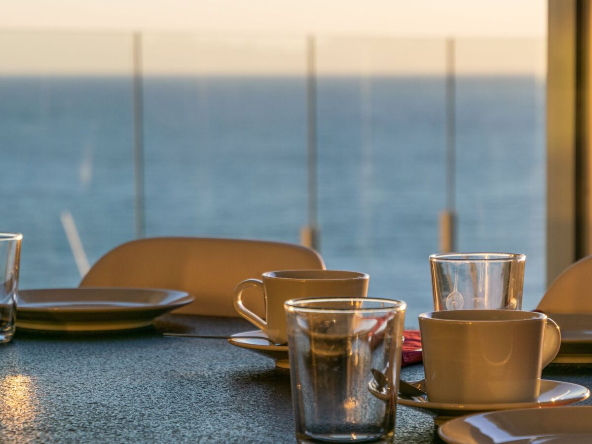 Sur la gauche vous aurez une toilette puis une grande cuisine entièrement équipée avec un ilot central double frigo, four micro-ondes et four traditionnel, lave-vaisselle, Nespresso, et une table pour le repas.Toutes les pièces disposent d’une vue sur la mer et d’un accès direct à terrasse de plus de 120m2.