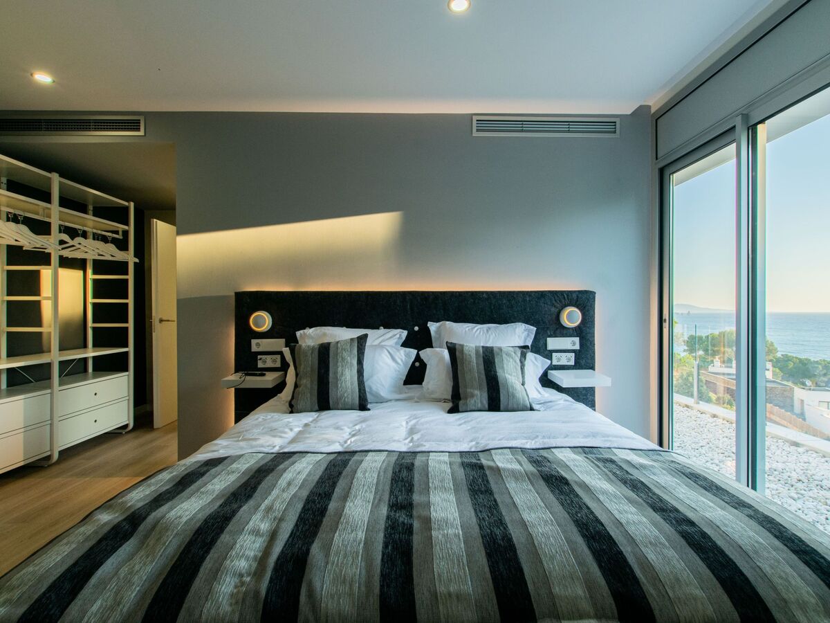 Sa salle de bain dispose de deux éviers, d’une baignoire jacuzzi, d’une douche à l’italienne, d’une toilette et d’un bidet.Aiguablava : Suite parentale avec son dressing et sa salle de bain attenante.