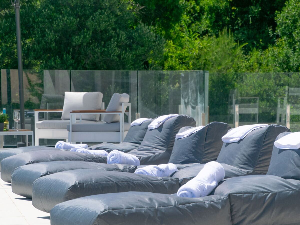 Des bains de soleil Fatboy permettent de profiter de l’espace autour de la piscine.