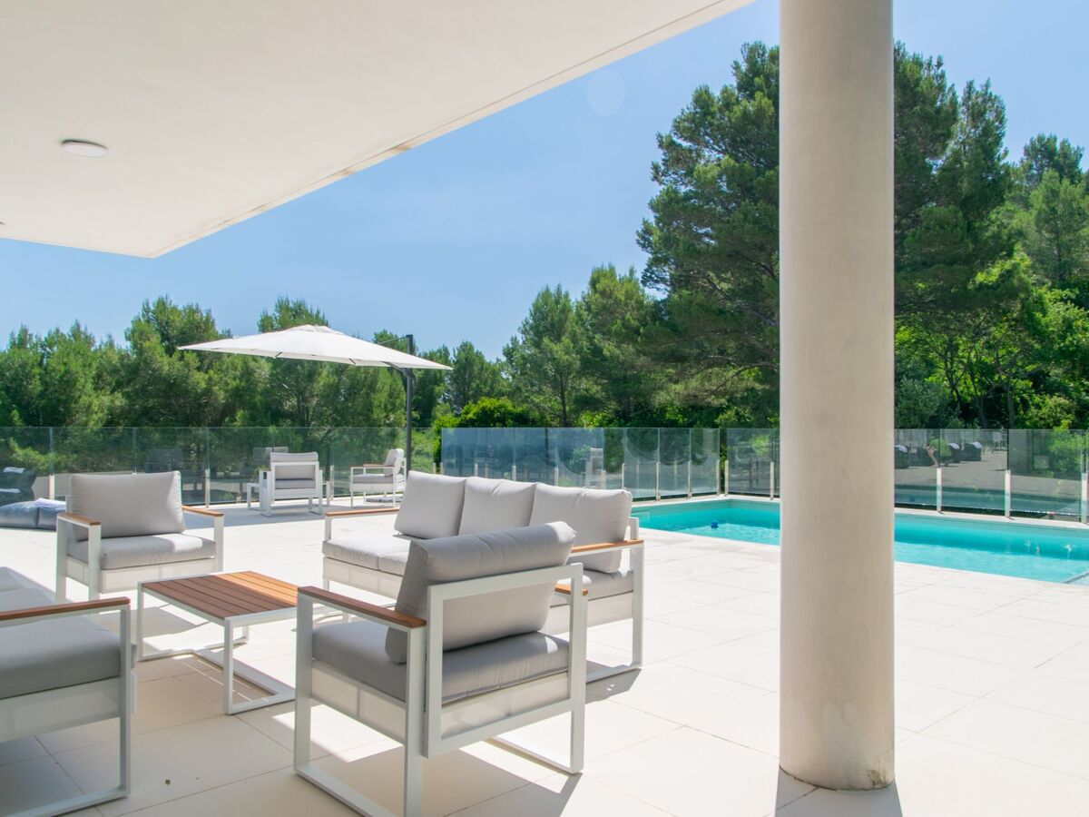 La piscine se trouve à droite de la terrasse, à l’abris des regards.