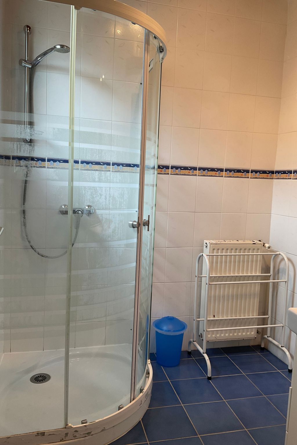 Salon avec TV, deux canapés.Salle d'eau avec douche et wc indépendant.