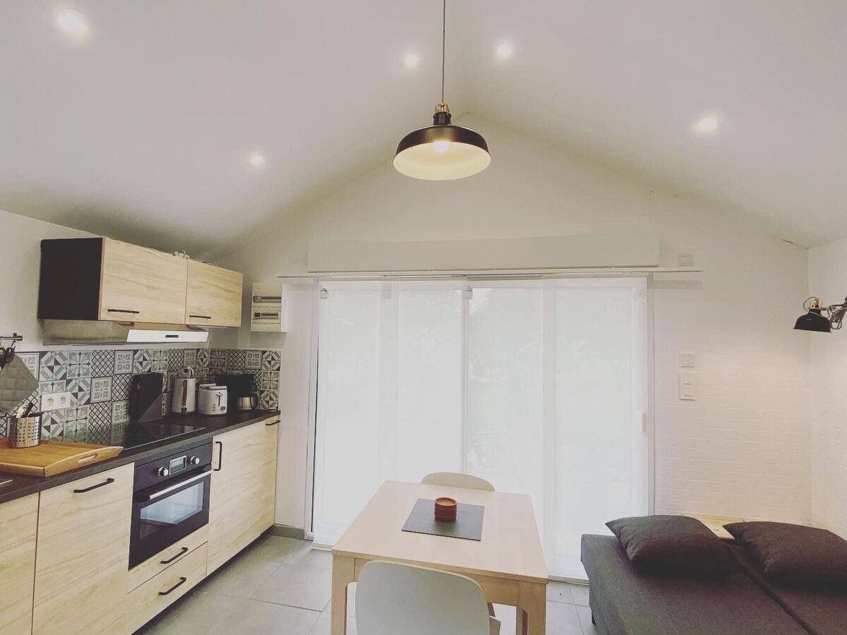 The 25m² holiday home has a bedroom with a queen-size (160 cm) double bed, a bathroom with shower, large washbasin and WC as well as a living/sleeping/kitchen area.