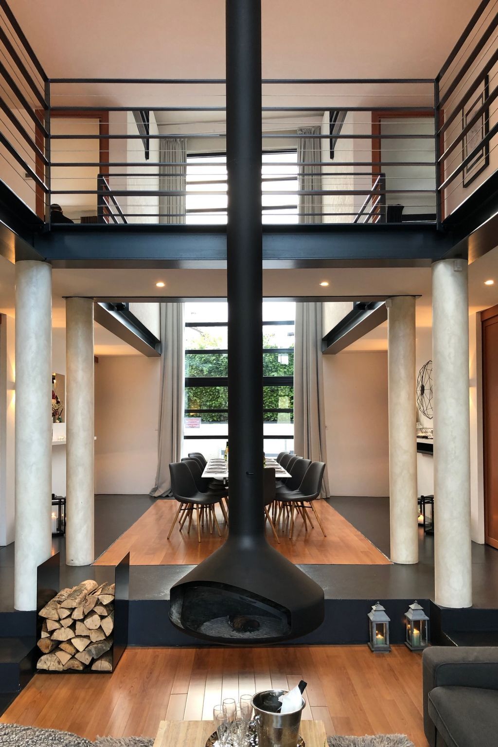 Au premier niveau, une magnifique cheminée suspendue trône au milieu du salon.