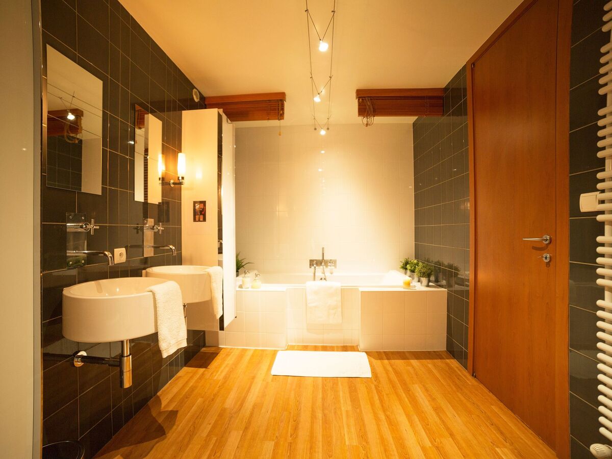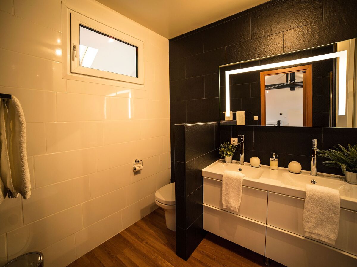 Vous trouverez également une grande salle de bain avec une double-vasque, une baignoire, une douche et une toilette.