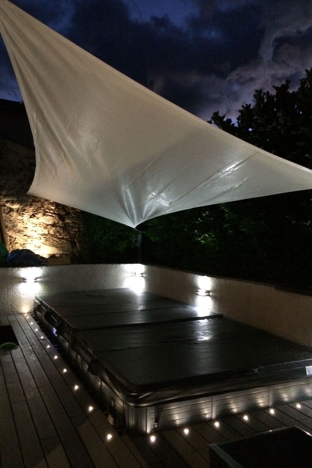 Vous serez protégés par une belle voile d'ombrage pour lorsque vous profiterez du Jacuzzi ou du spa de nage à contre-courant.