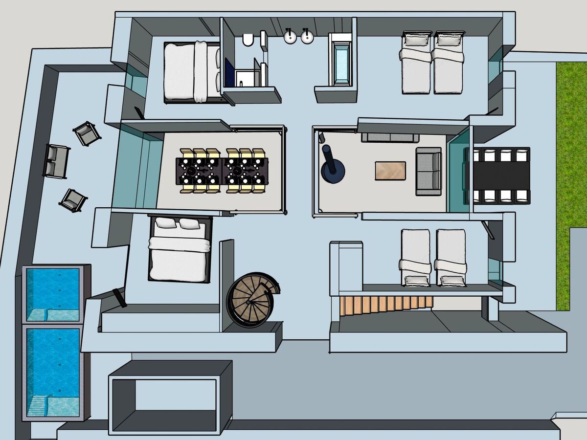 Au second niveau se trouvent aux quatre coins, les quatre chambres : deux avec des lits doubles et deux avec des lits à l’italienne (qui peuvent, selon vos souhaits, être préparés en un couchage double ou deux couchages simples).
