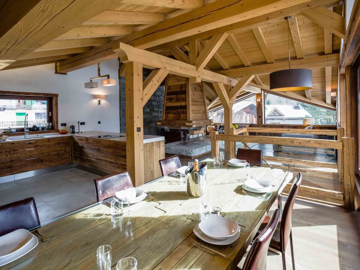 Recently built, the chalet is finished to a very high standard with a huge open plan living room on the first floor with feature fireplace, and doors leading to large sunny terrace facing Mont Blanc.