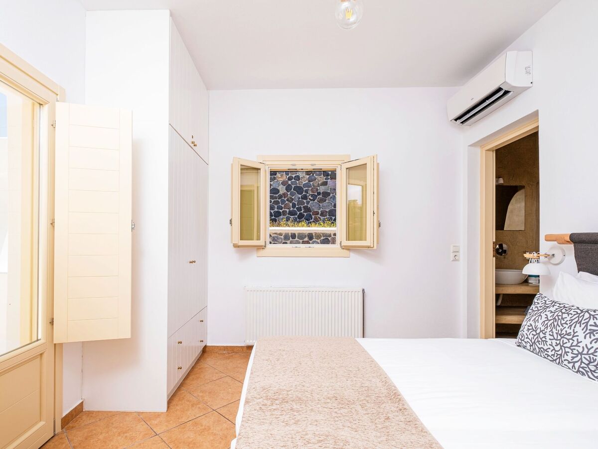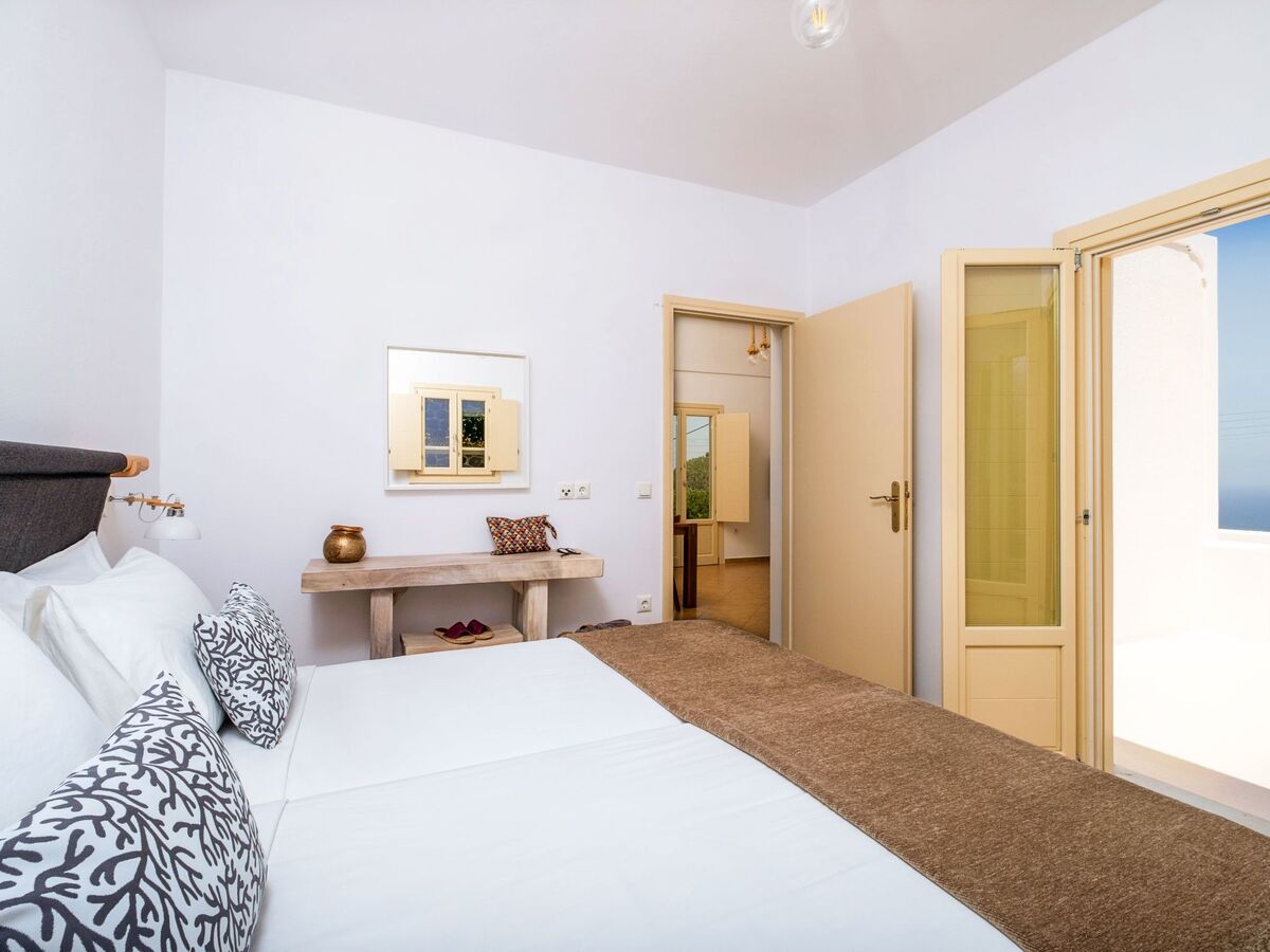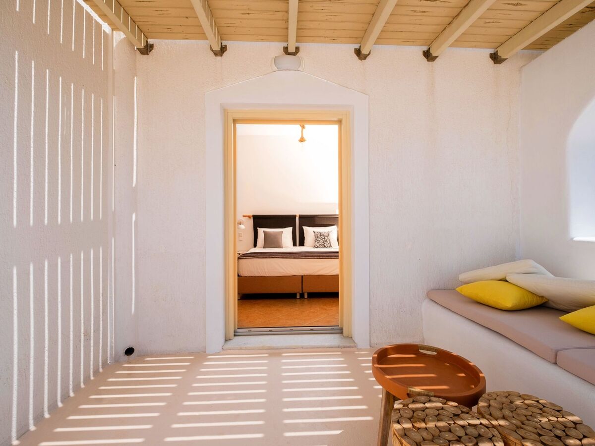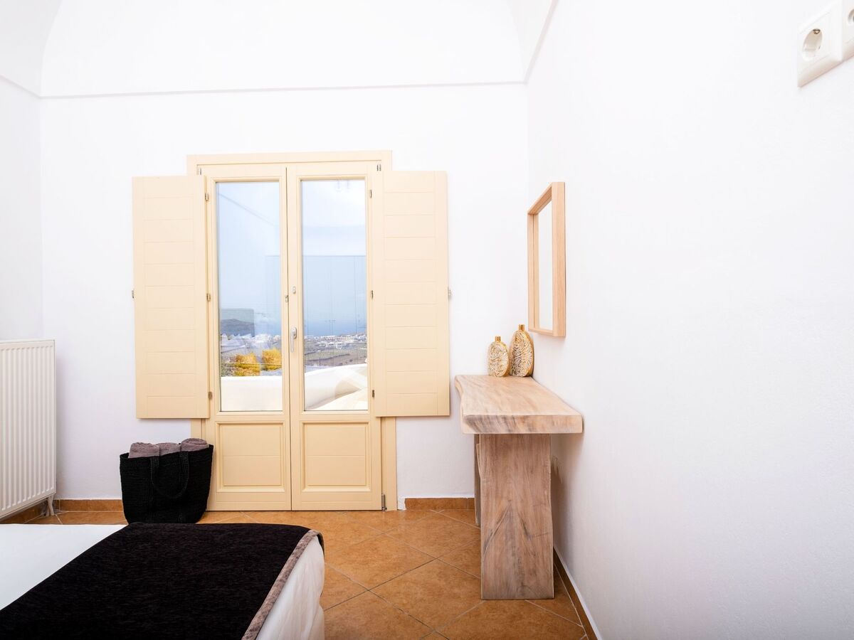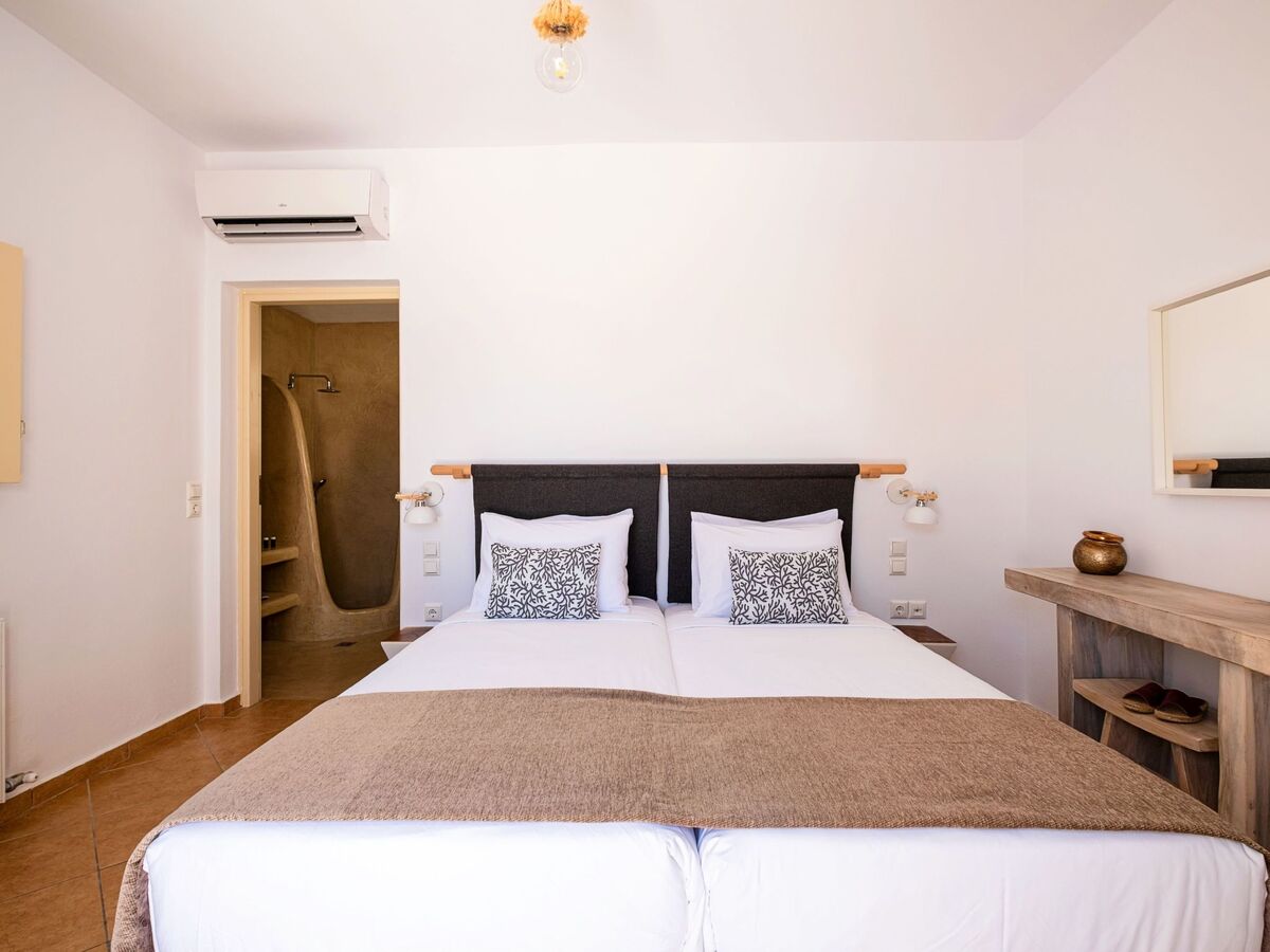 Elle dispose d'un mobilier moderne en bois clair et offre les mêmes équipements que la chambre principale, ainsi que de belles vues sur la mer Égée et le village médiéval historique de Pyrgos.
