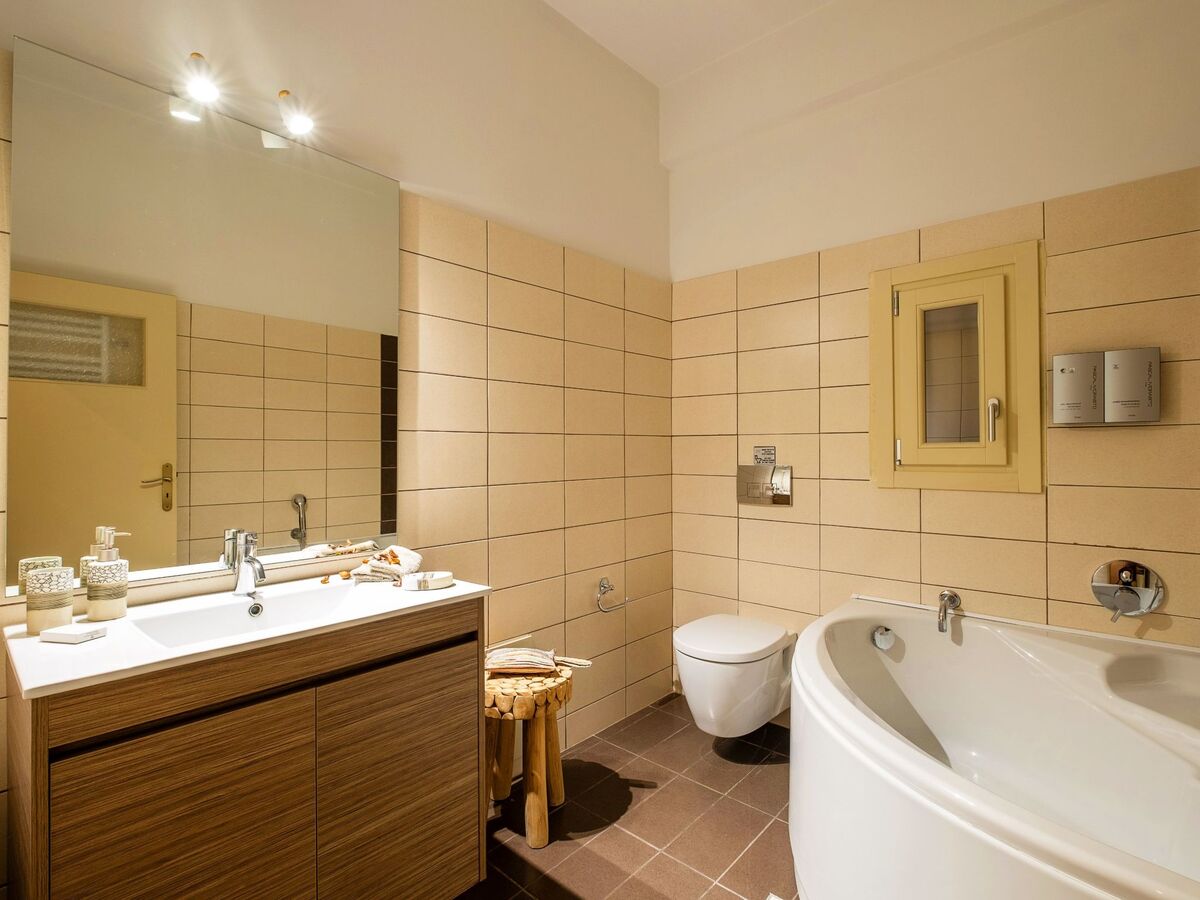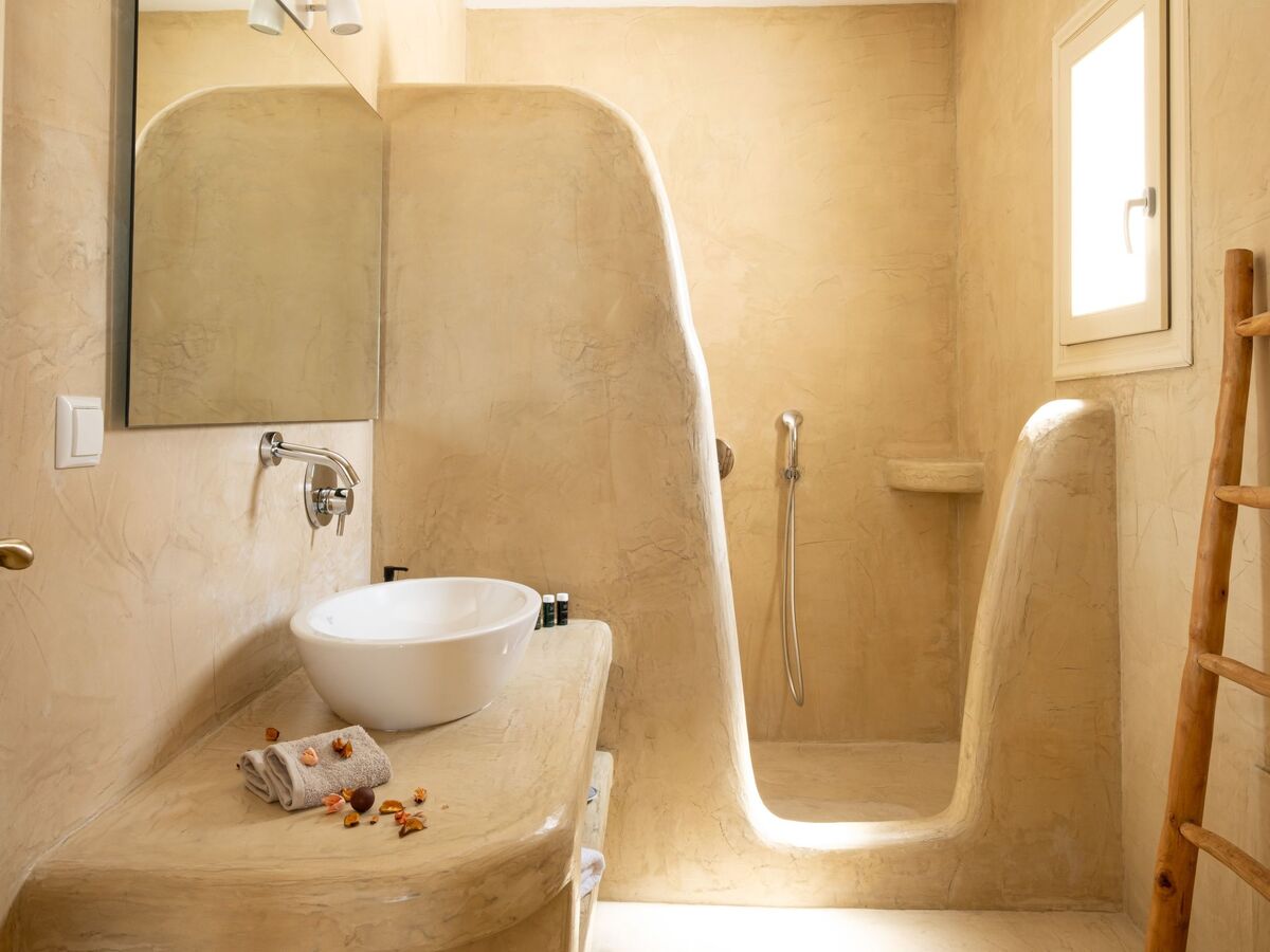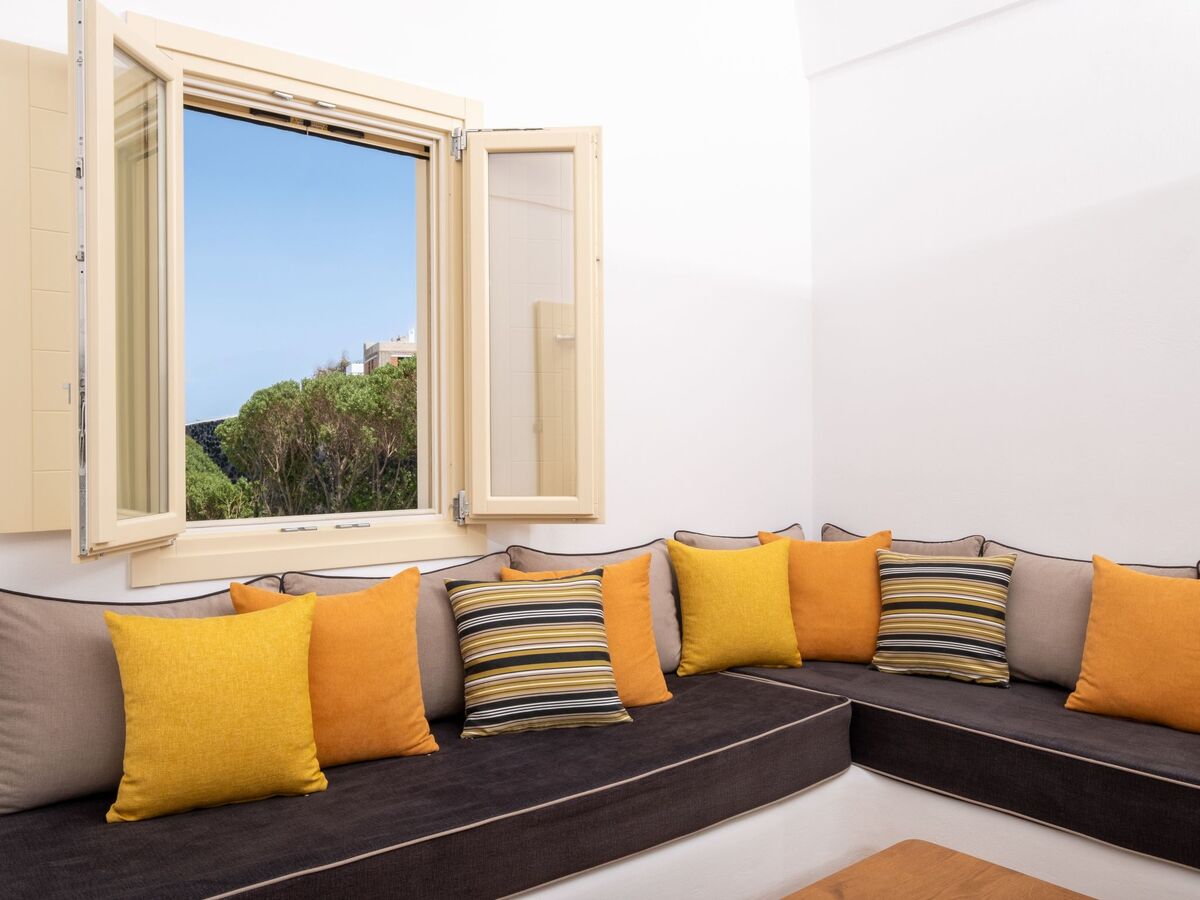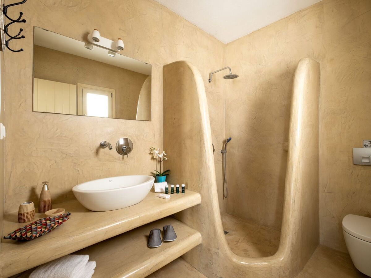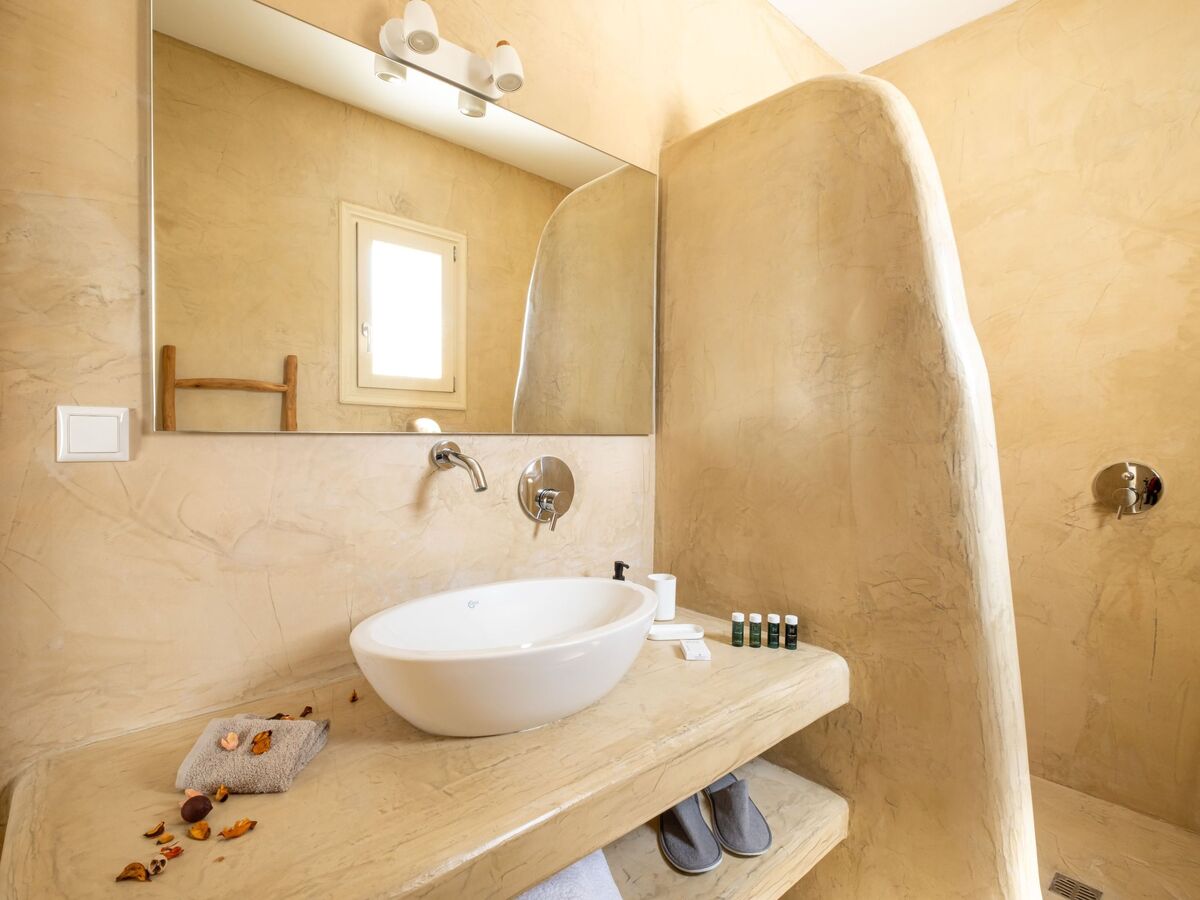Elle dispose d'un mobilier moderne en bois clair et offre les mêmes équipements que la chambre principale, ainsi que de belles vues sur la mer Égée et le village médiéval historique de Pyrgos.