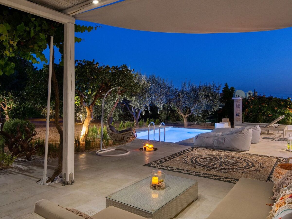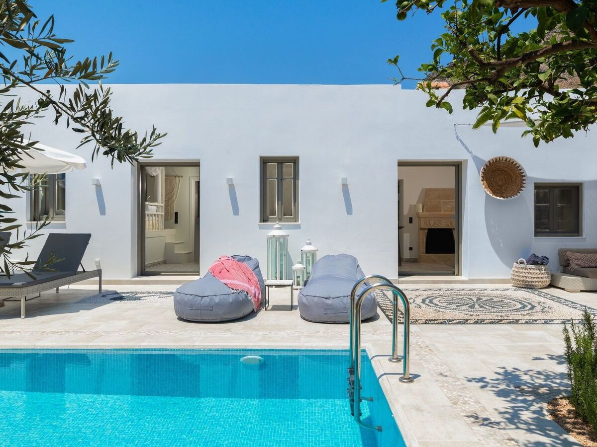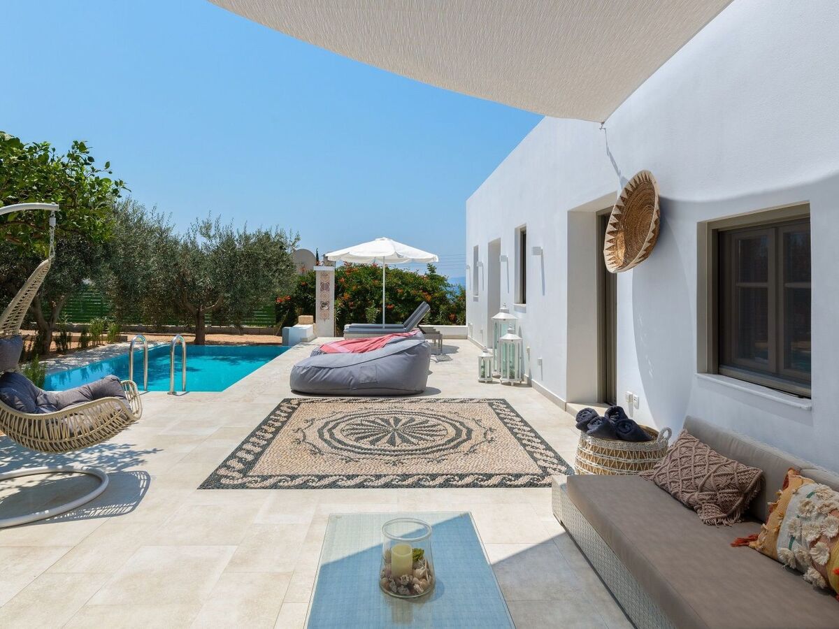 Il y a également beaucoup d'espace autour de la piscine pour profiter du soleil grec en se prélassant sur les chaises longues ou les poufs Vous pouvez aussi essayer la chaise hamac pour changer.