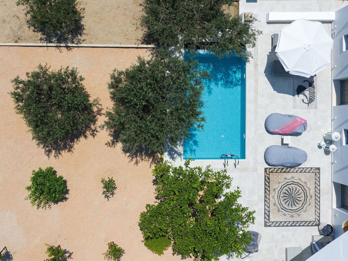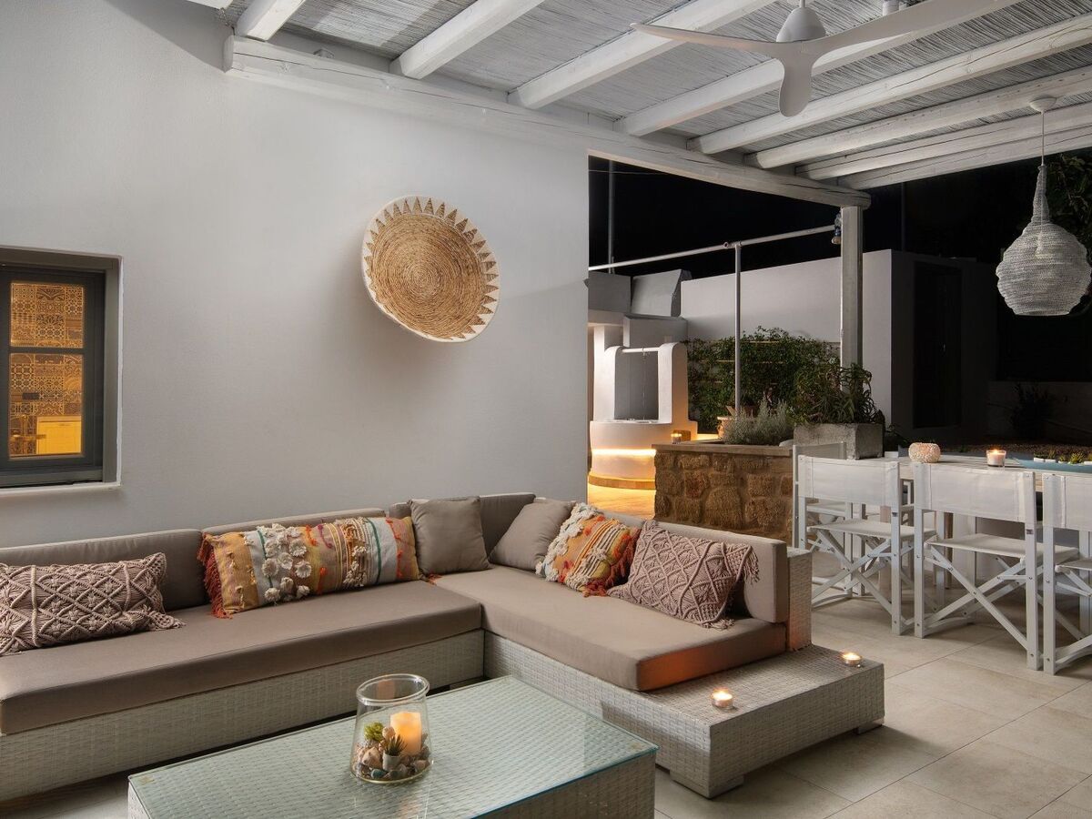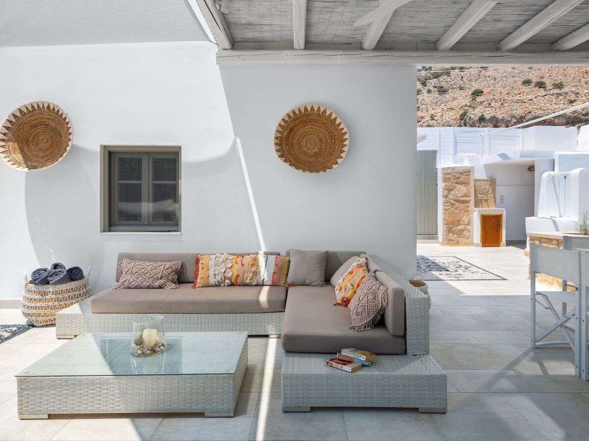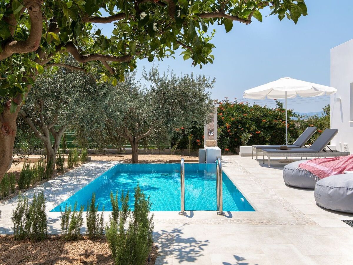 Il y a également beaucoup d'espace autour de la piscine pour profiter du soleil grec en se prélassant sur les chaises longues ou les poufs Vous pouvez aussi essayer la chaise hamac pour changer.